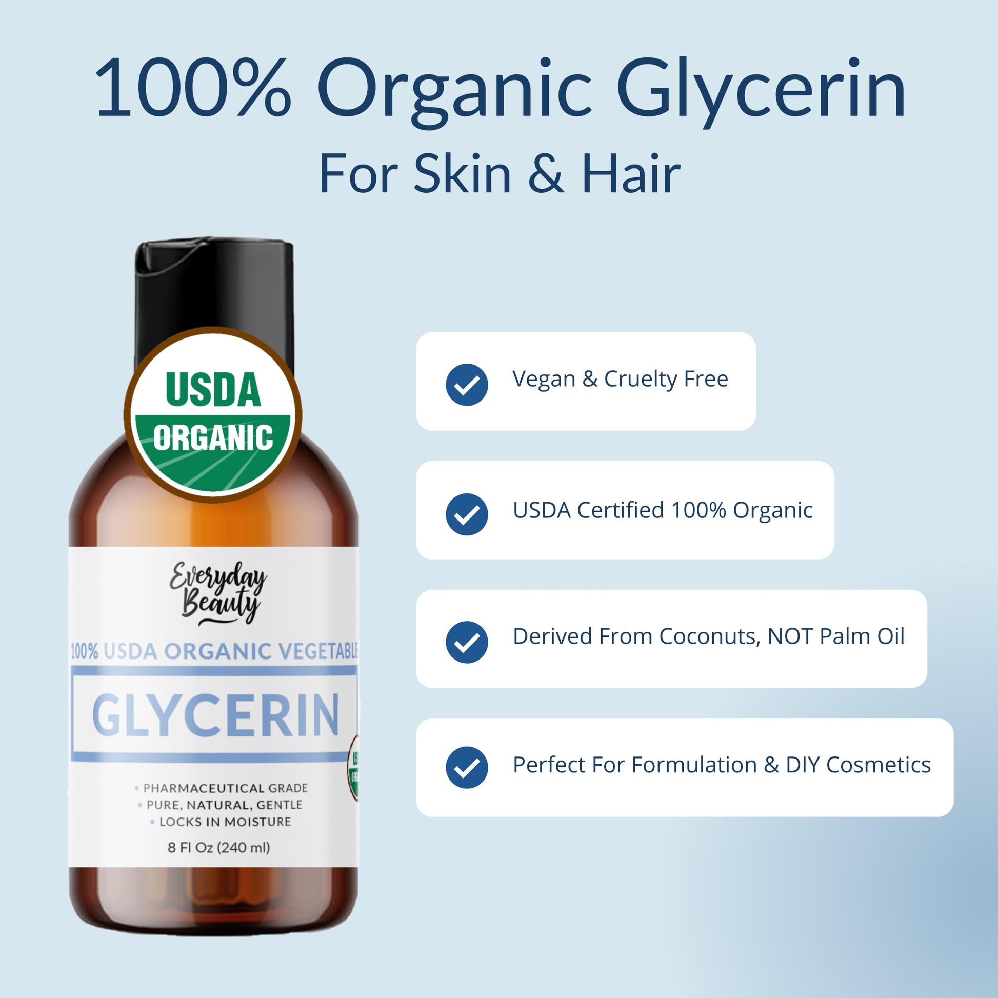- Gentle and Non-Irritating: Due to its 100% organic nature,our glycerin is gentle on the skin and suitable for all skin types, including sensitive skin. Making it ideal for use in various skincare formulations. A perfect base for cosmetics and formulation, our 100% Organic Glycerin allows you to formulate cosmetics and still be above the 95% organic to qualify for your own USDA Certified Organic formulation.