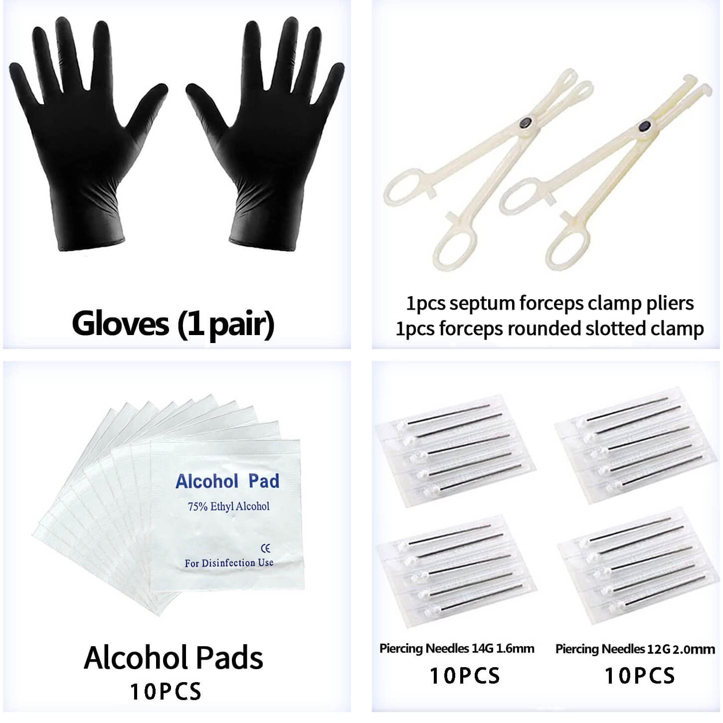 - High-Quality Piercing Tools: Our kit includes 10 12G piercing needles for 14G jewelry, 10 14G piercing needles for 16G jewelry (please note that only 12G needles are compatible with 14G jewelry as per industry standards), 2 piercing clamps, 2 black latex gloves, and 10 alcohol pads. All items are 100% sterilized using E.O. gas to ensure safe to use.