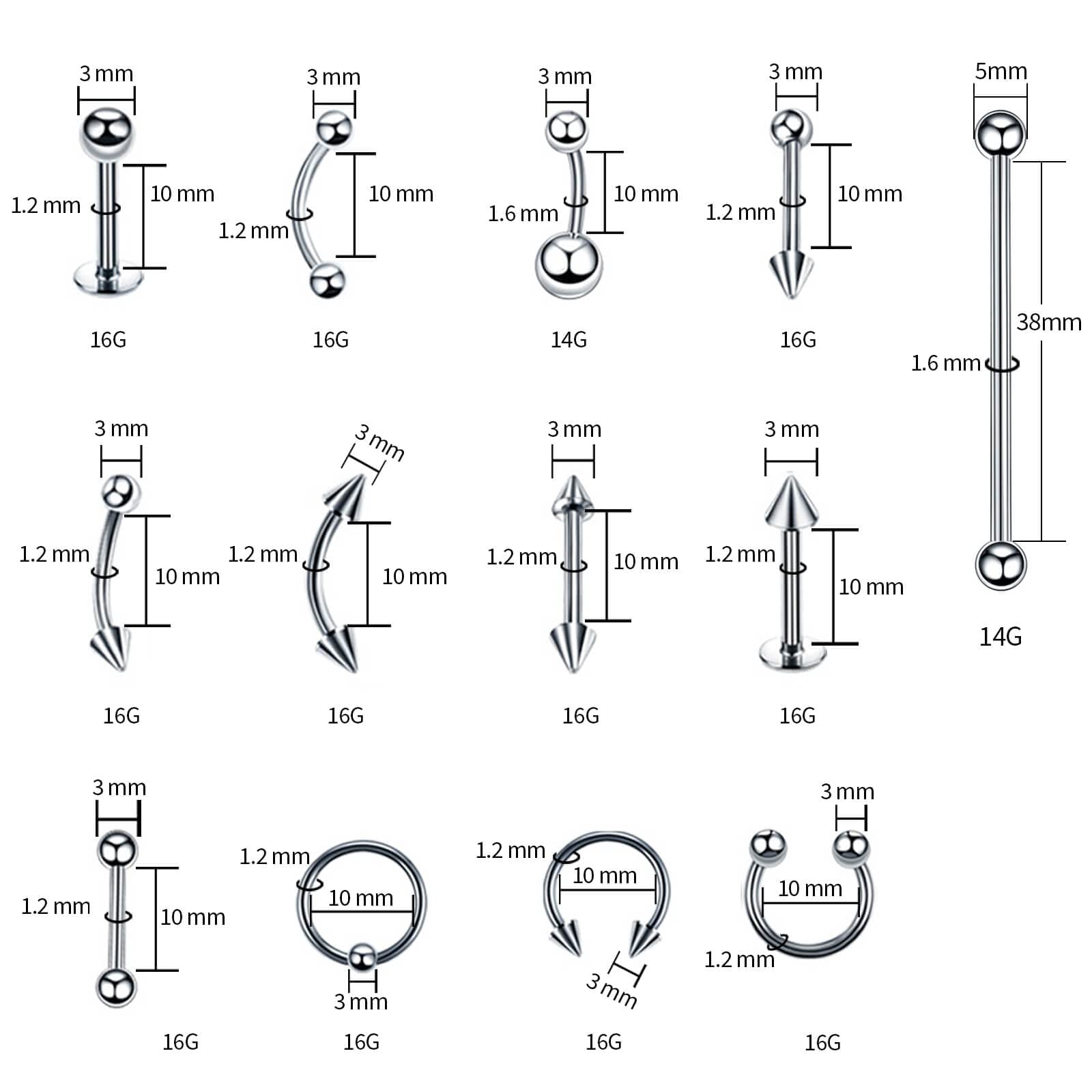 - Premium Silver Piercing Jewelry: Our kit features 5 belly button rings (14G), 10 titanium industrial barbells (16G, 10mm/38mm), 5 horseshoe nose rings (16G), 5 captive bead rings (16G), 5 spike horseshoe rings (16G), 15 curved barbell ball spikes (16G), 10 straight barbells with cone (16G), 5 labret stud spikes (16G), and 5 labret barbells (16G). All items are 100% sterilized using EO gas to ensure safe to use.