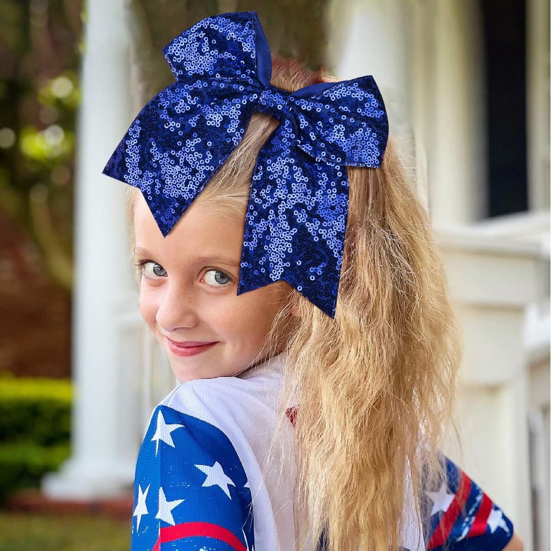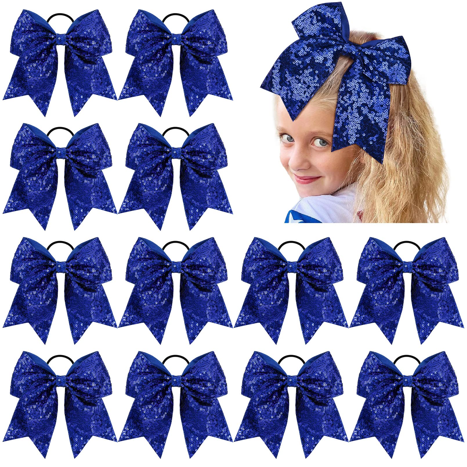 12 PCS 8" Large Glitter Cheer Bows Blue Girl Hair Bows Sparkly Cheerleading Softball Team Bow Hair Accessories for cheerleaders football Competition Sports