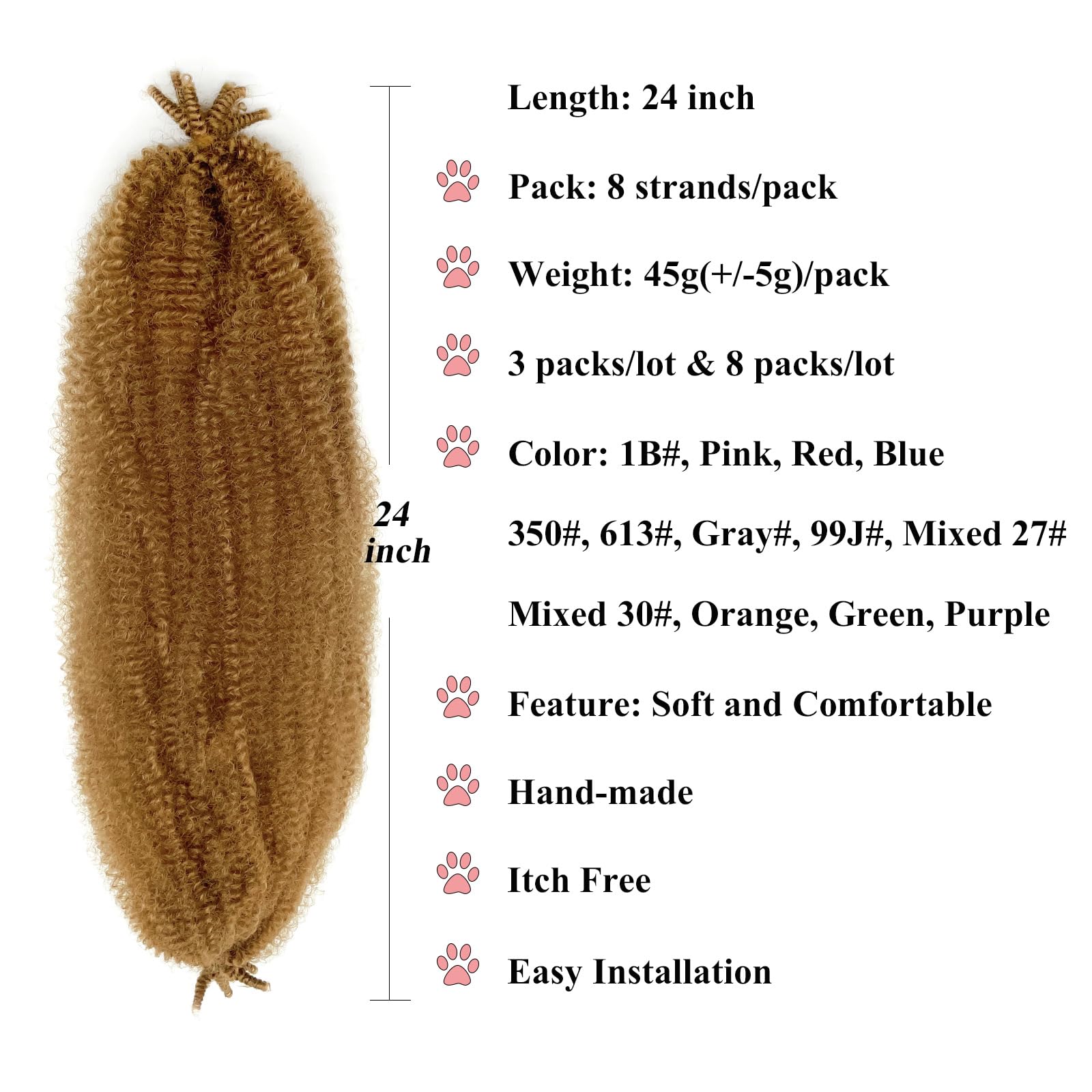 - Springy Afro Twist Hair 24 inch: Ai Yuchen Marley Twist Braiding Hair Made With 100% Premium Flame-Retardant Synthetic Fibers, Marley Braiding Hair is Pre Stretched / Pre Fluffed Spring Twist Hair.