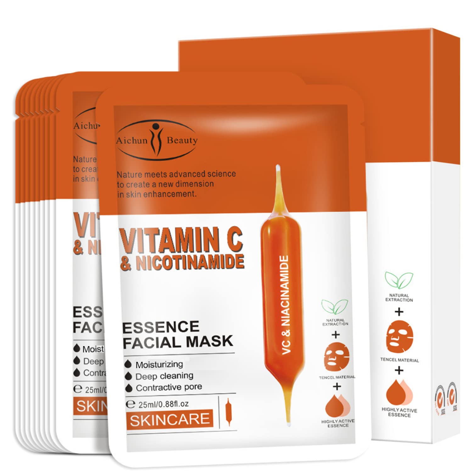 AICHUN BEAUTY Essence Facial Mask Tencel Material Anti-acne Anti-wrinkles After Sun Moisturizing Deep Cleaning Contractive Pore 25ml/0.88fl.oz X 10pcs (VITAMIN C & NICOTINAMIDE(10pcs))