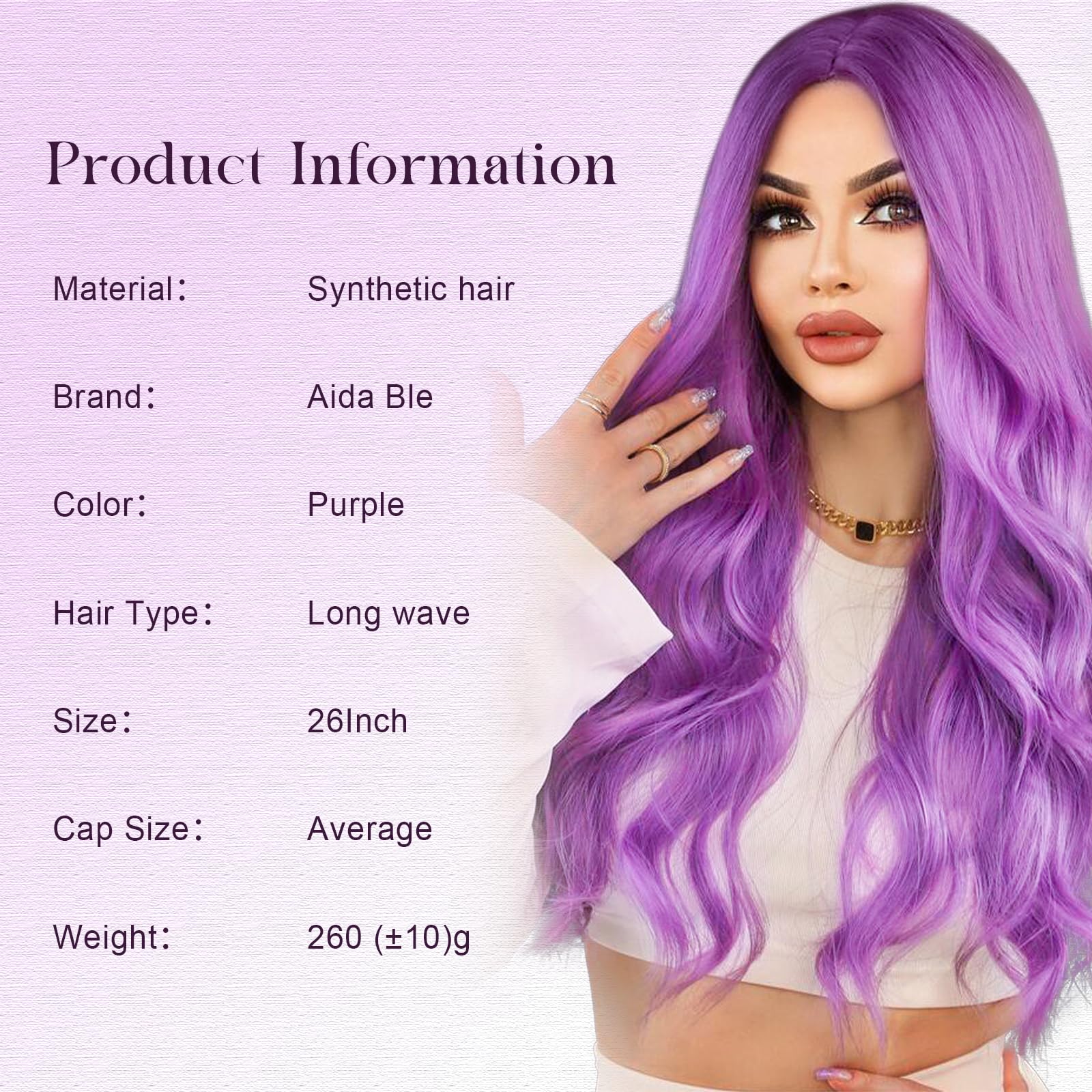 Aida ble Long Purple Wavy Wig for Women 26inch Lavender Purple Wavy Wig Natural Curly Synthetic Heat Resistant Wigs for Girls Halloween Cosplay Daily Party Use