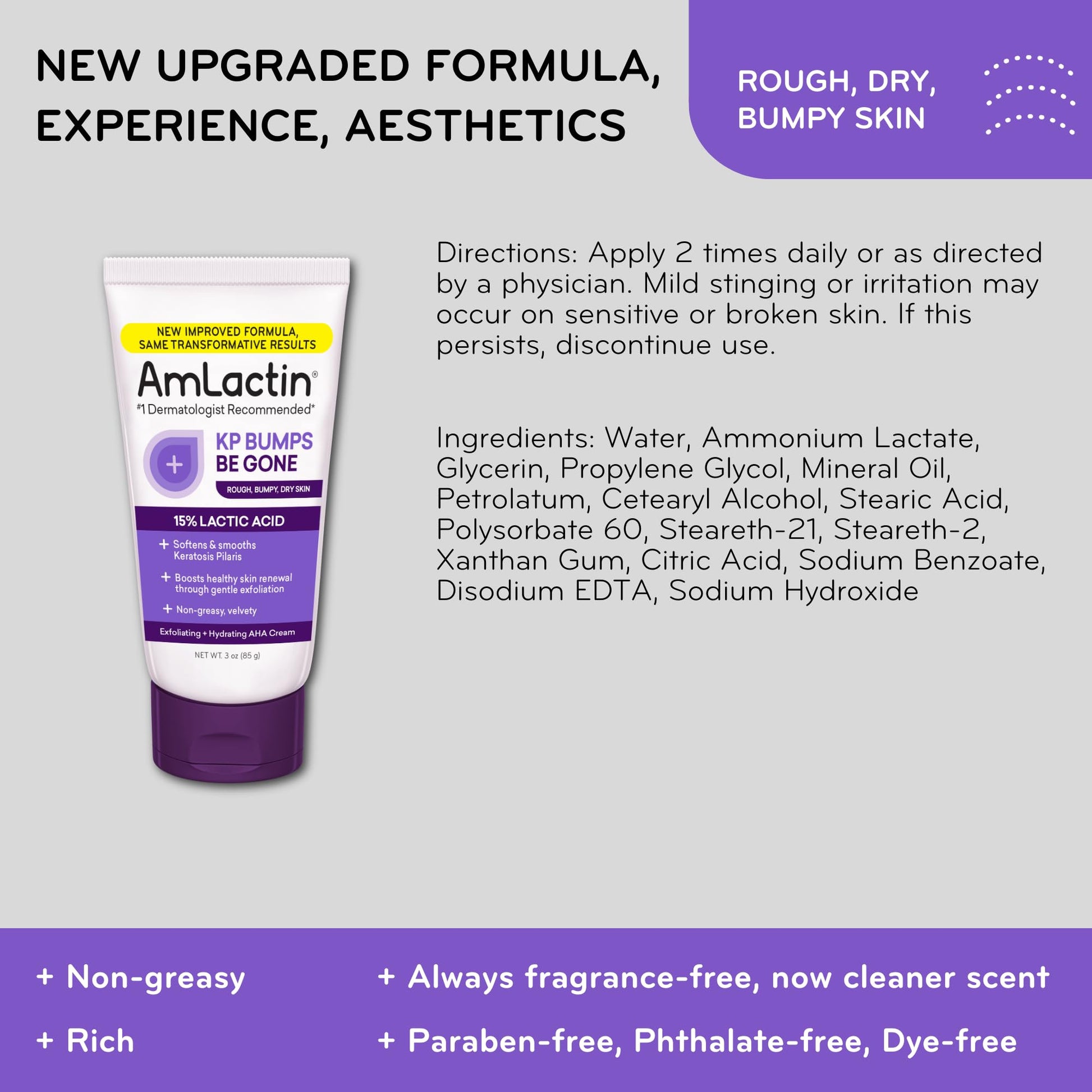 - Our formula: AmLactin KP Bumps Be Gone uses a fast-acting, multitasking formula that deeply hydrates to improve texture while 15% lactic acid, a gentle yet effective AHA, exfoliates dead skin cells and promotes skin cell turnover