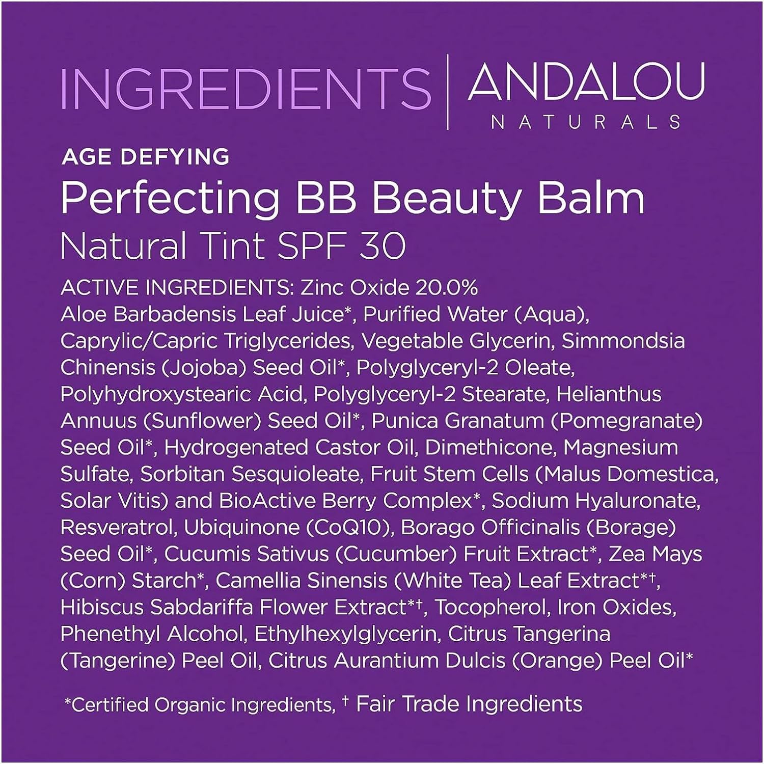 Details: SPF 30 Tinted Moisturizer, Face Sunscreen with Broad Spectrum Protection Indulge in the perfecting goodness of Andalou Naturals BB Beauty Balm, your ultimate skin-perfecting treatment for a flawless complexion. Enriched with super fruit antioxidants, resveratrol and CoQ10, this BB cream helps boost dermal vitality, keeping your skin nourished and healthy and its self-adjusting mineral-tint color provides beautiful coverage. Our chemical-free and nanoparticle-free formula ensures that you get the best sun protection possible without any harmful chemicals. This BB Beauty Balm nourishes and protects your skin while providing a natural, flawless finish. Blend it seamlessly into your facial routine for a rejuvenated complexion. At Andalou Naturals, we want you to feel empowered and confident in yourself, especially when it comes to what you put on your skin. That's why we infuse Fruit Stem Cell Science, with unique and innovative ingredients to provide skincare solutions to target your skincare concerns and support healthy skin. Our products feature only ingredients that are gluten-free, sustainable, cruelty-free and nature-derived. Non-GMO remains a core brand value of Andalou Naturals and we continue to source superior non-GMO ingredients for our products.