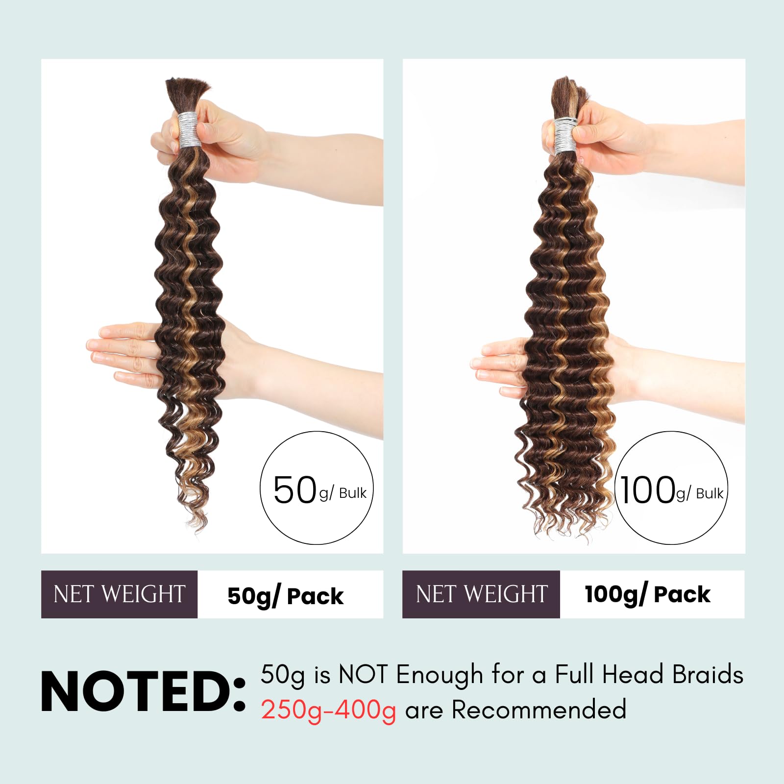 - 👑Details: 16-26 inch human braiding hair in stock. 100g ± 5g each deep wave braiding human hair bulk. If you want to make a full head braids, 3-6 packs are recommended.