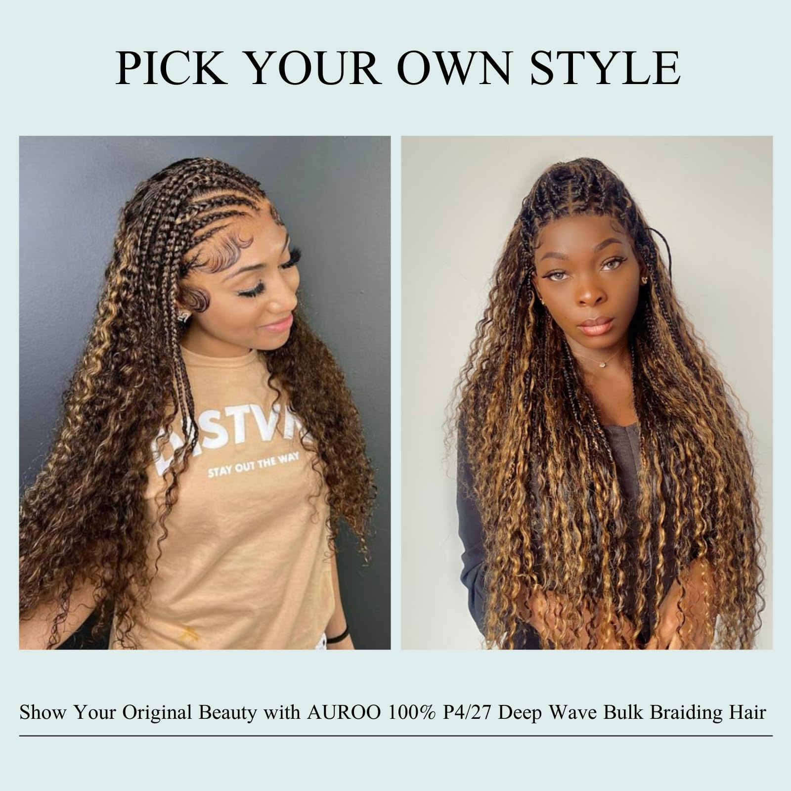 - 👑10A Human Hair: AUROO deep wave bulk human hair for braiding use 100% Brazilian virgin human hair cut directly from young donors, thick n soft, bouncy n glossy. No chemical processed bulk human hair for boho braids is strong n duranble, no odors, last more than 12 months with proper care.