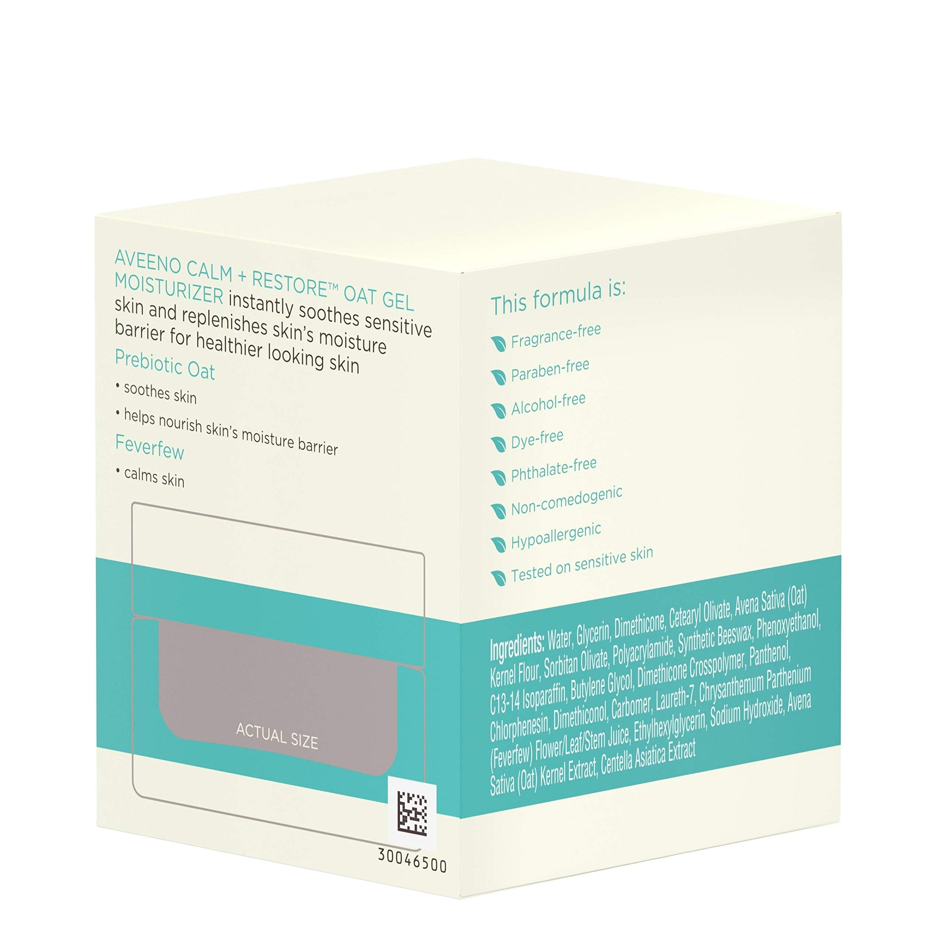 Details: Nourish your sensitive, irritated and dry skin with Aveeno Calm + Restore Oat Gel Facial Moisturizer. Tested to be gentle on sensitive skin, this lightweight gel cream from a dermatologist-recommended skincare brand instantly soothes sensitive skin, replenishes its moisture barrier while strengthening skin's moisture barrier for long-lasting resilience. term. The moisturizing gel cream continues to hydrate for 24 hours, so even sensitive skin feels comfortable all day. Formulated with prebiotic oats, the gel cream helps soothe dryness and nourish the skin's natural moisture barrier. The hypoallergenic, non-comedogenic formula is free of fragrance, parabens, alcohol, dyes and phthalates and is non-greasy. Twice a day, massage the gel moisturizer directly onto your face in an upward and outward motion.