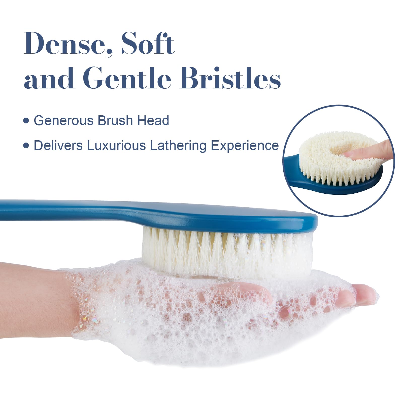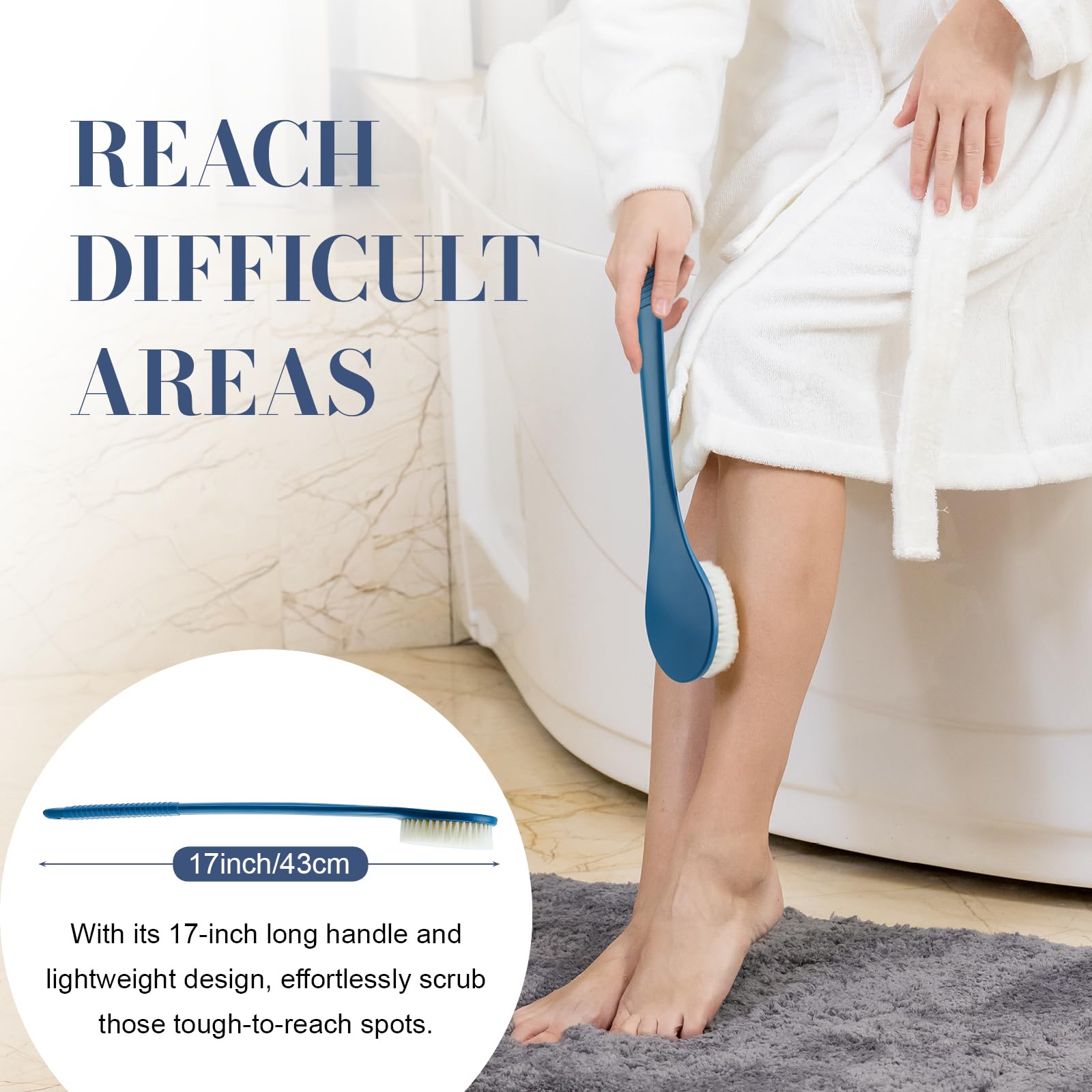 - EXTENED LENGTH OF REACH: To cater to its multi-functional role as a back brush for showering, we've upgraded the handle length to 17 inches, allowing you to effortlessly cover hard-to-reach areas like your back, lower legs, and feet without bending over. This feature proves particularly valuable for individuals with limited shoulder mobility or difficulty in bending their waist. Additionally, its slight curvature enhances ease of use with every stroke.