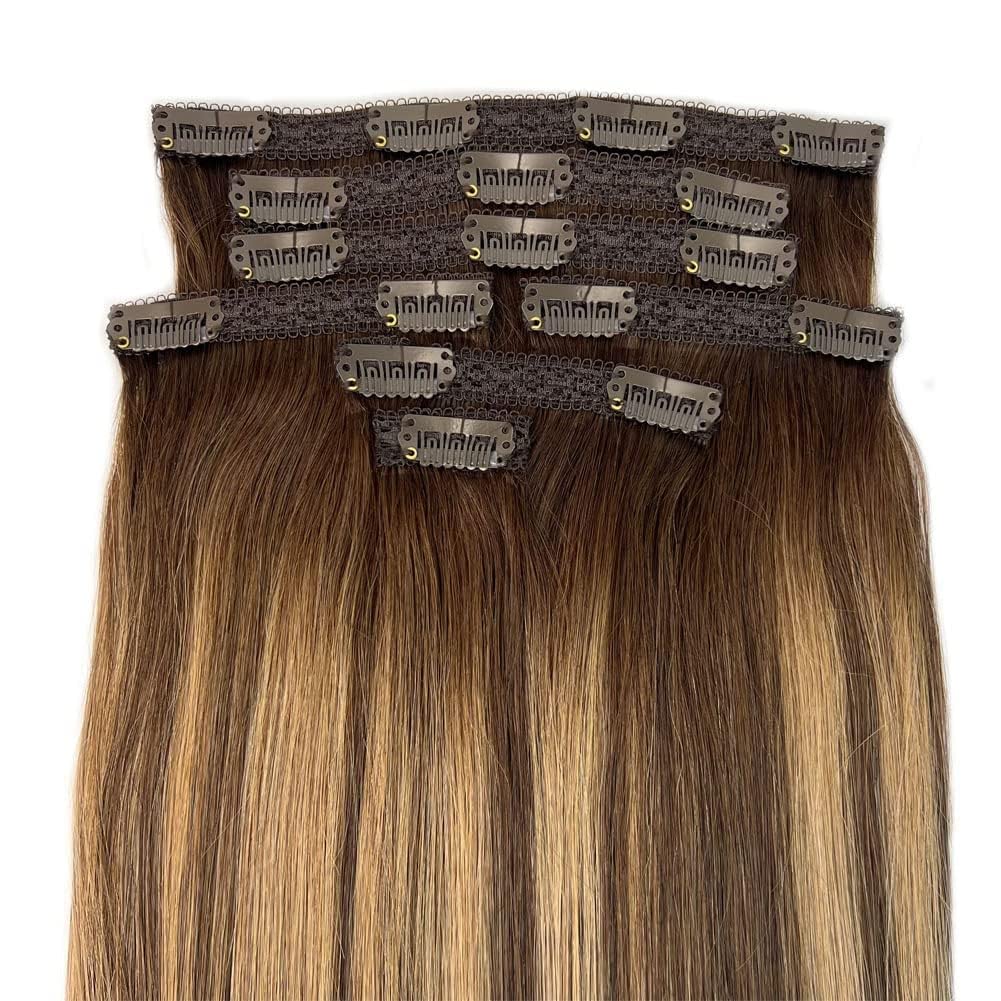 Brown Clip in Medium Length Real Human Hair Extensions 16 Inch Balayage Brown Hair Extensions Easy to Use with Clips 120g
