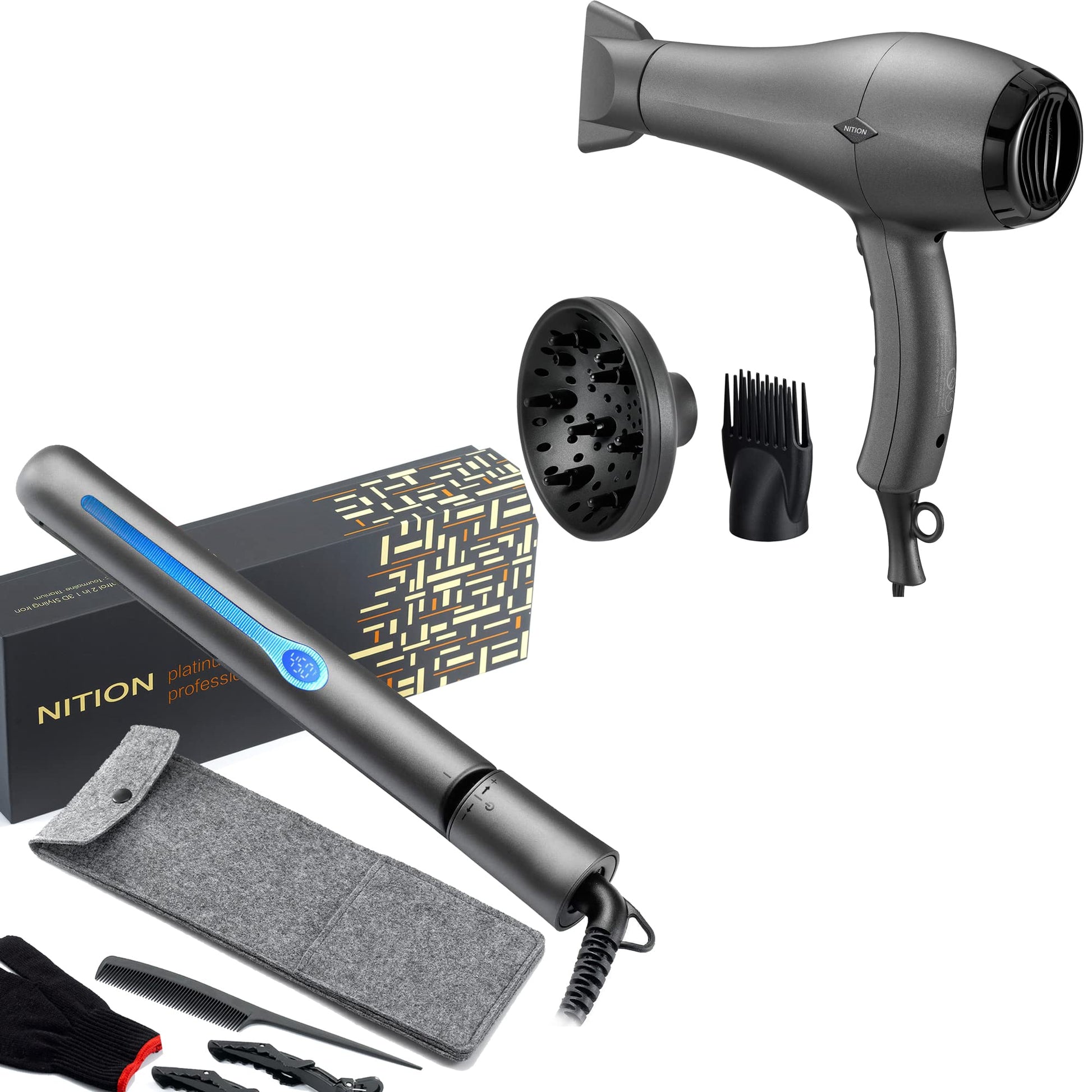 NITION Salon Hair Flat Iron and Hair Dryer with Diffuser/Comb Set