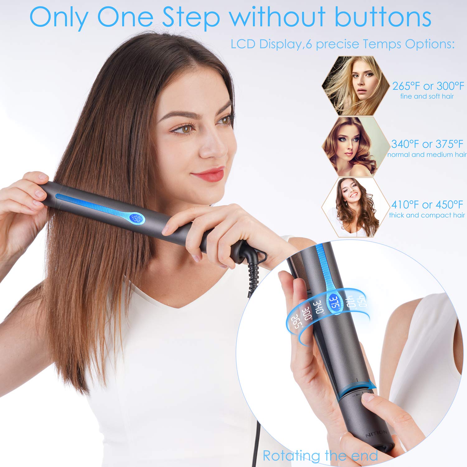 - ♚MAX 450°F LCD Display 6 Precise Temperatures Option. 265/300/340/375/410/450°F for ALL HAIR TYPE.Simple One Step Operation without any buttons by revolving the end: Clockwise to power on and desired your favorite salon high heat temp.Anticlockwise to decrease the temperature and power off.