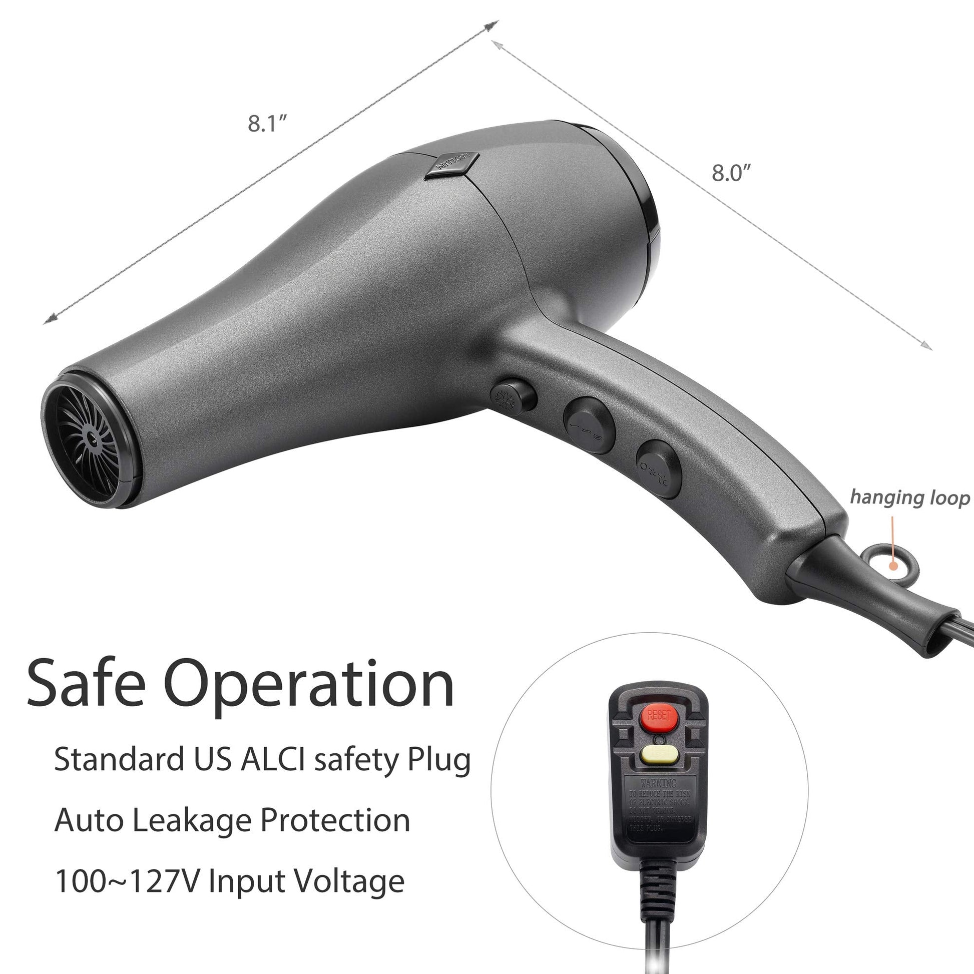 - ♚Powerful 1875 Watt Motor which produce strong air flow to dry hair with low noise.Double protection circuit design.Standard US ALCI safety Plug for Auto Leakage Protection.7.5ft salon power cord with hanging loop.100V~127V USA Voltage input.