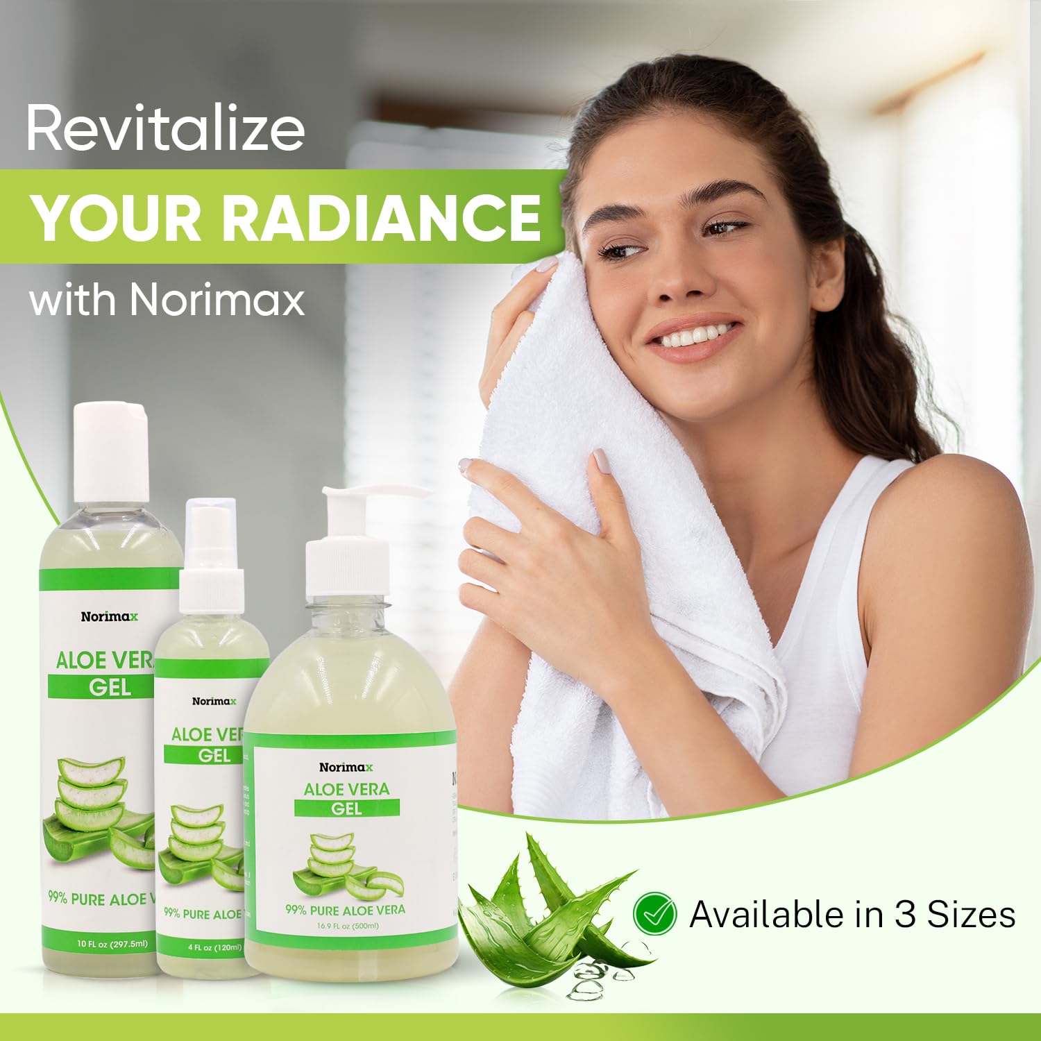 Norimax Natural Aloe Vera Gel for Hair, Scalp, Face, Dry Skin, Sunburn, & Sensitive Skin - Cold Pressed, Vegan, Unscented - Soothing Aloe Face Moisturizer (10 oz.)