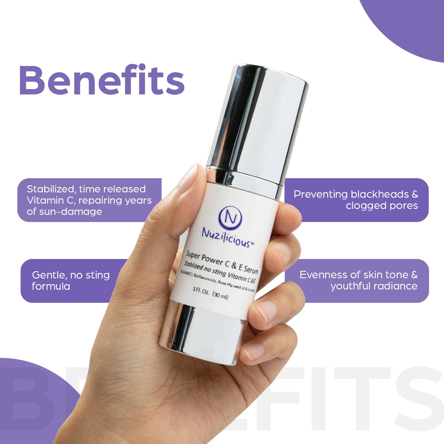 Nuzilicious Professional Grade Super C & E Serum – Vitamin C & E for Radiant, Youthful Skin, Stabilized Formula, Vegan & Cruelty-Free Glow-Up Serum, 1 oz
