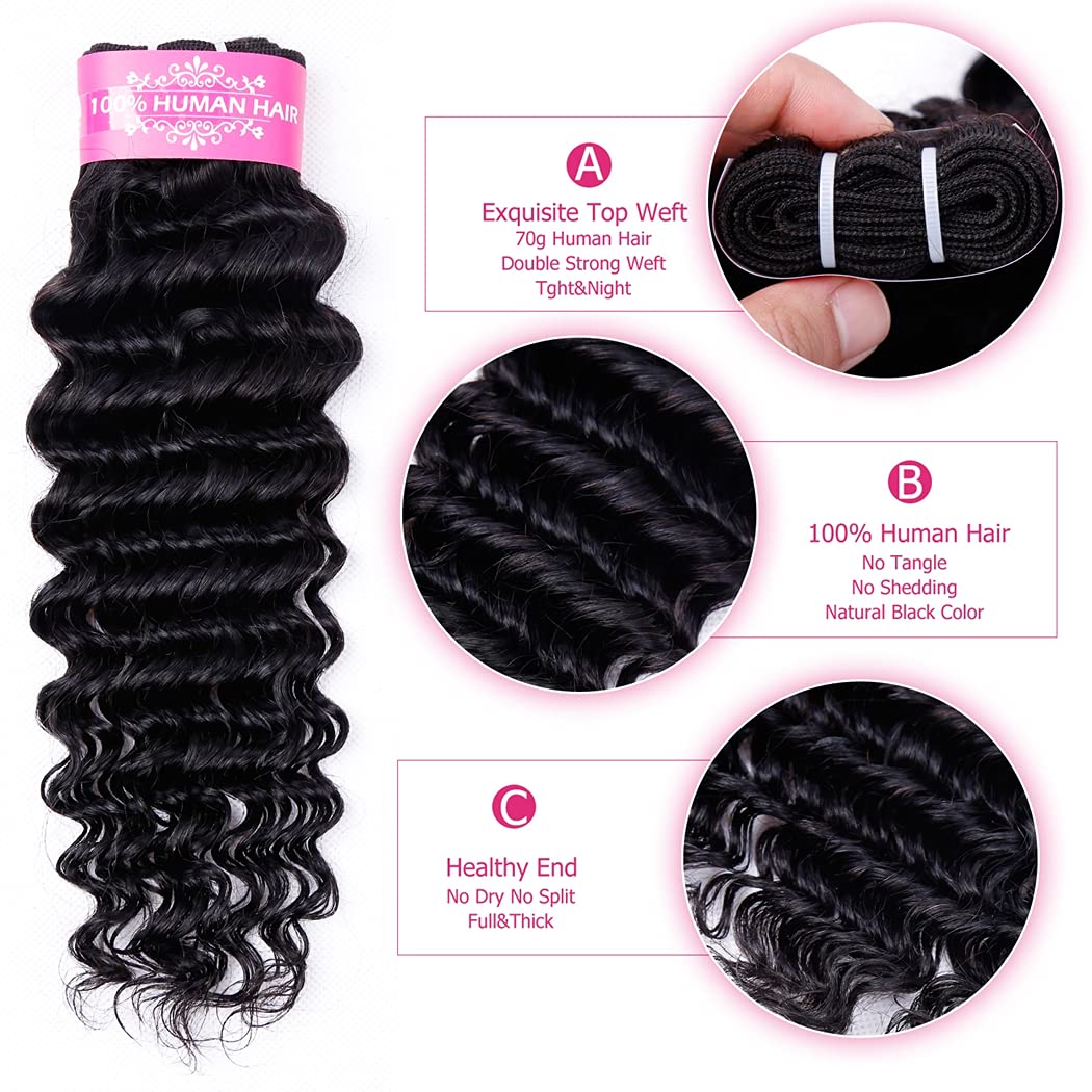 - Hair Feature: Deep Wave Human Hair 3 Bundles with Lace Closure, Hair Color: 1B Natural Black, Hair Bundles: 70 Grams Each Bundle, 10-30 Inch in Stock, Lace Closure: 30-50 Grams Each Piece, 8-22 Inch in Stock.