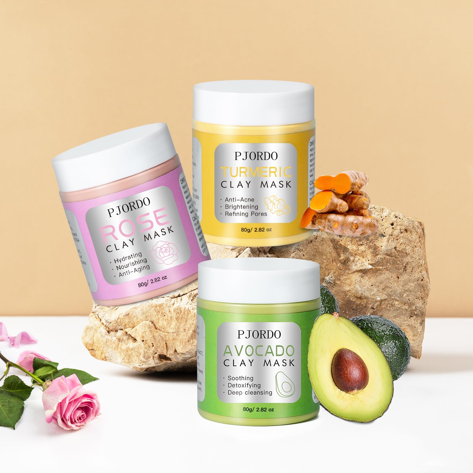 Pjordo Clay Mask Kit, Turmeric Vitamin C Clay Mask, Avocado Clay Mask, Rose Clay Mask, Facial Mask Skin Care Set for Deep Cleansing Reduce Blackheads Dark Spots, 2.82 Oz Each
