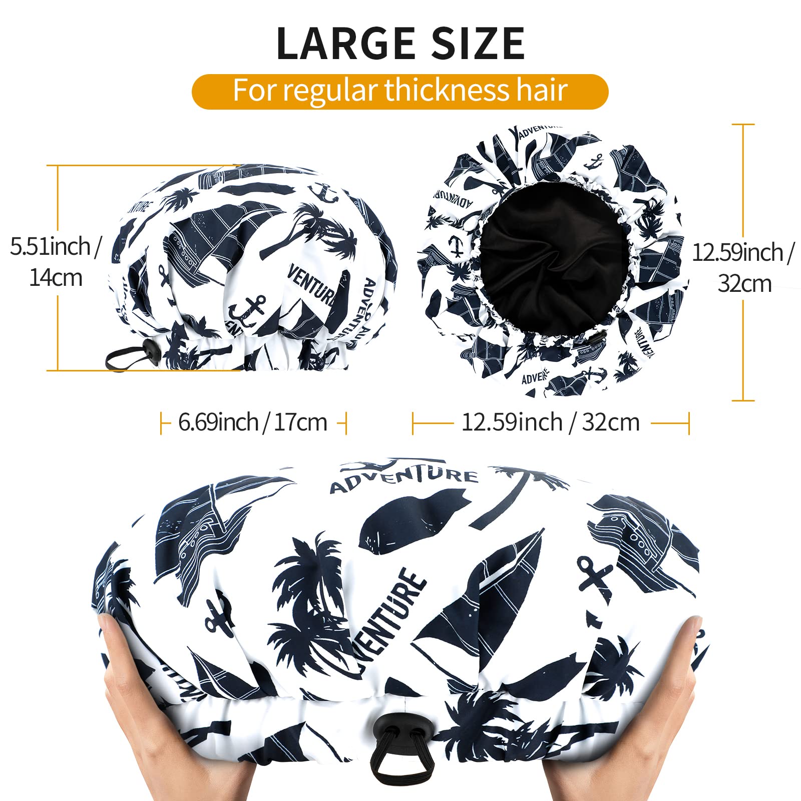 Details: Shower Cap for Women, Waterproof Reusable Shower Caps Double Layers Soft Silk Satin Lined, Extra Large for Long Hair, Adjustable for Most Heads Size