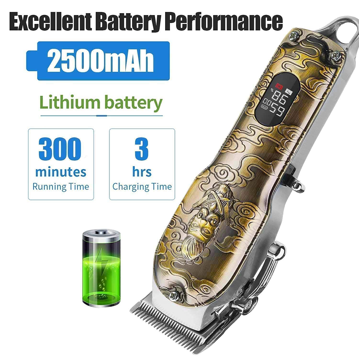 - Professional Cordless Hair Clippers: Equipped with large 2500mAh Li-ion battery, 3 hours charge for 300 min cordless use, which enables you to cut hair wherever you want. While the clipper is at a low battery status, you can connect with adaptor to charge.