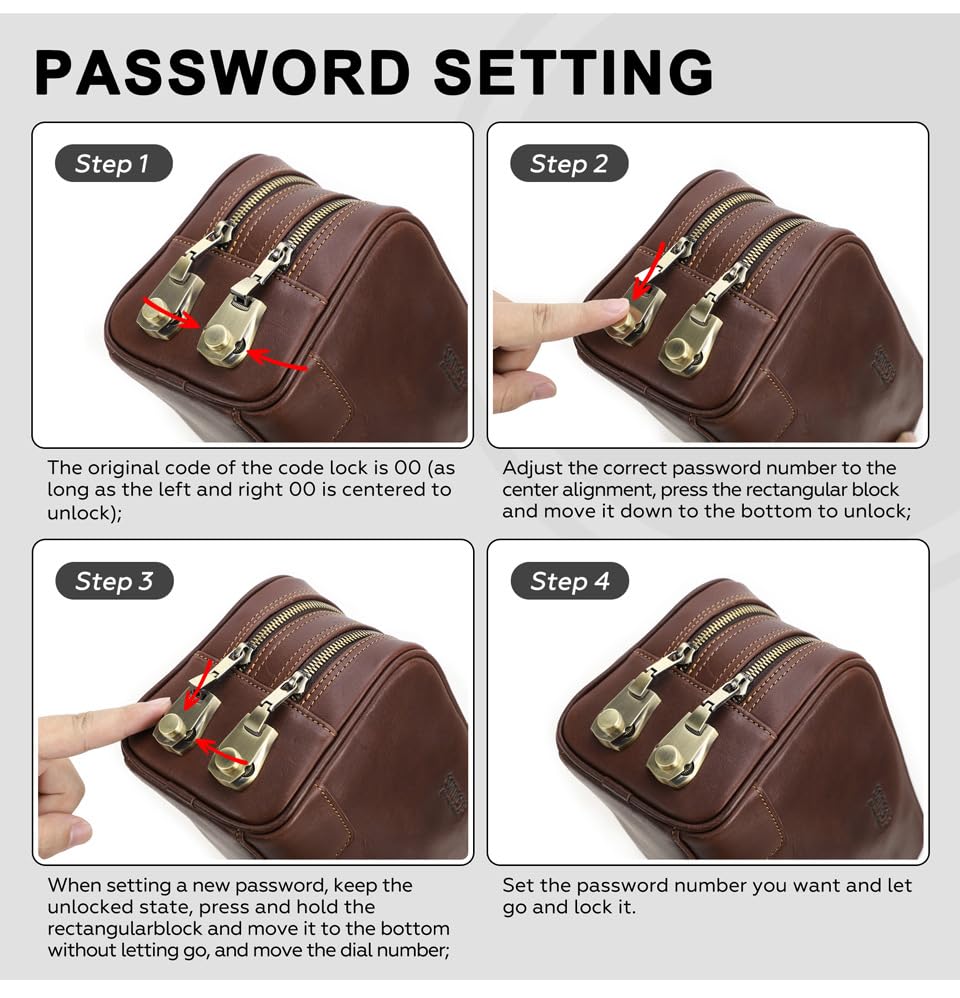 RC ROCKCOW Coded Lock Toiletry Bag, Mens Genuine Leather Travel Shaving Dopp Kit Anti Theft Business Wallet Clutch Purse Bag Organizer