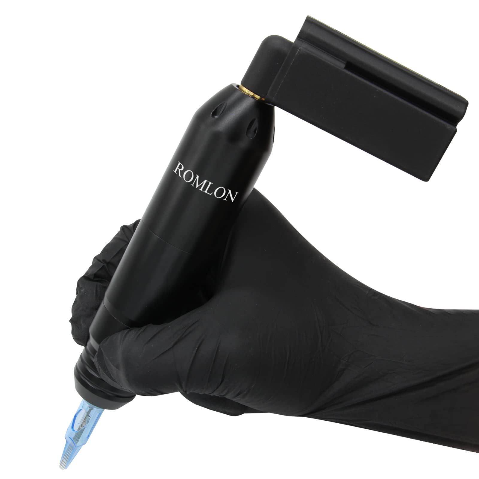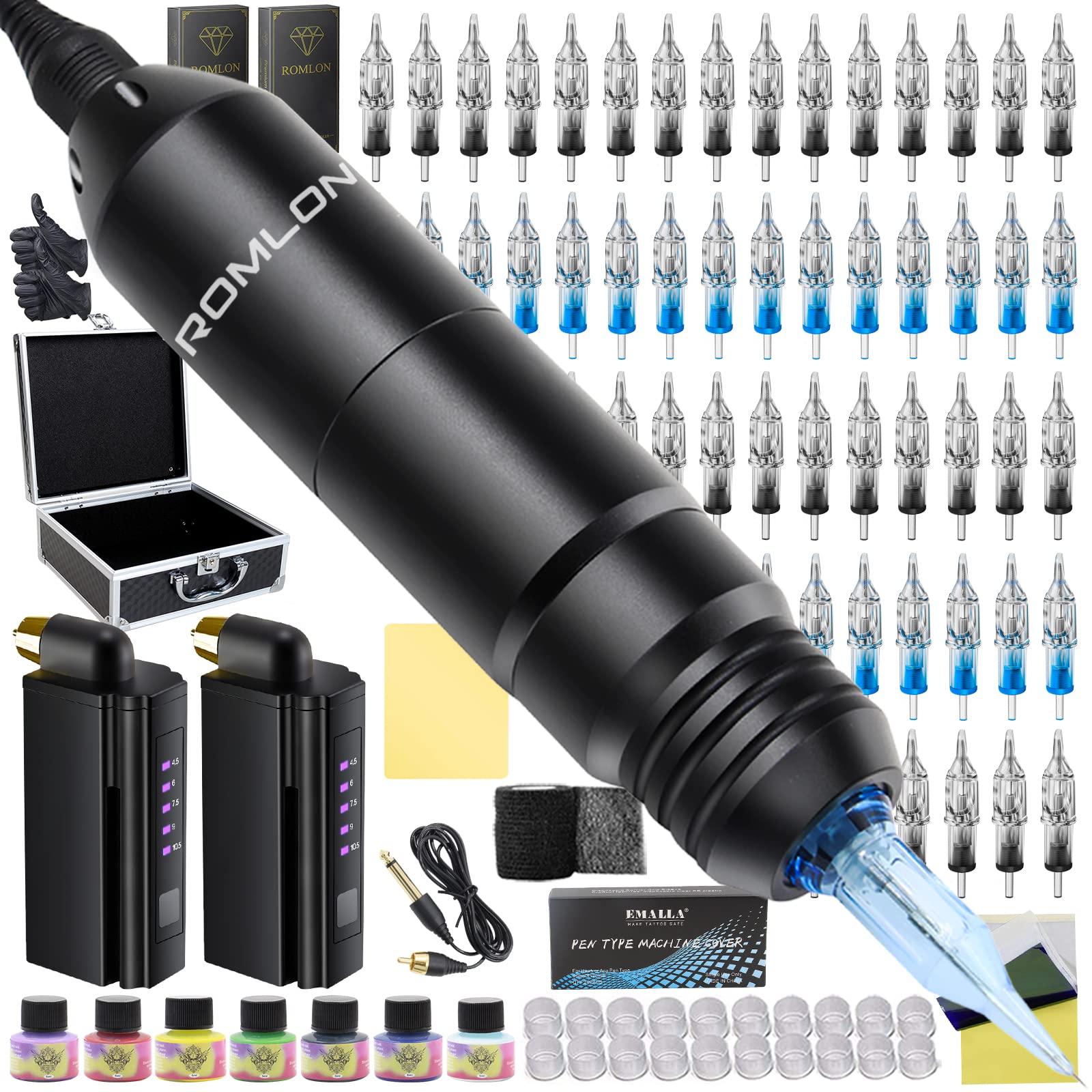 - 【TATTOO KIT】- Romlon tattoo kit, Including rotary tattoo machine pen with RCA connector, 2Pcs battery power supply cable, 40pcs assorted sizes cartridge needles, tattoo grip tape. Perfect tattoo kit suitable for beginners and tattoo artists.