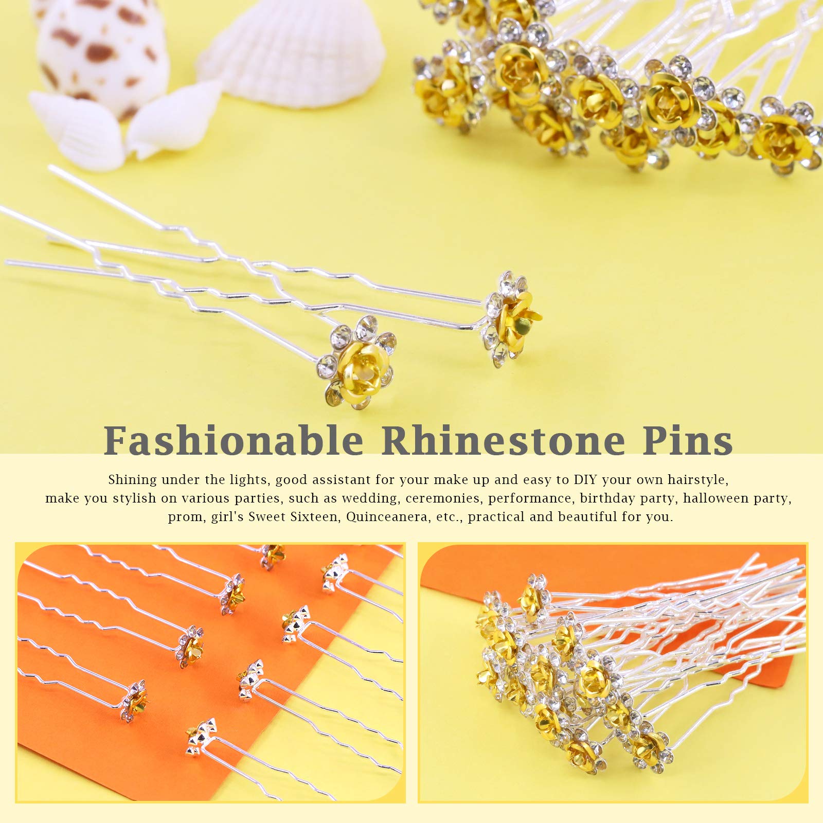 - 🌷【What you Get】Each package contains 40 pcs gold rose flower hair pins All of rhinestone hair pins are packed into a plastic case for store and carrying conveniently. In addition,we offer reliable after-sale service. Pls feel free contact us for any dissatisfaction.