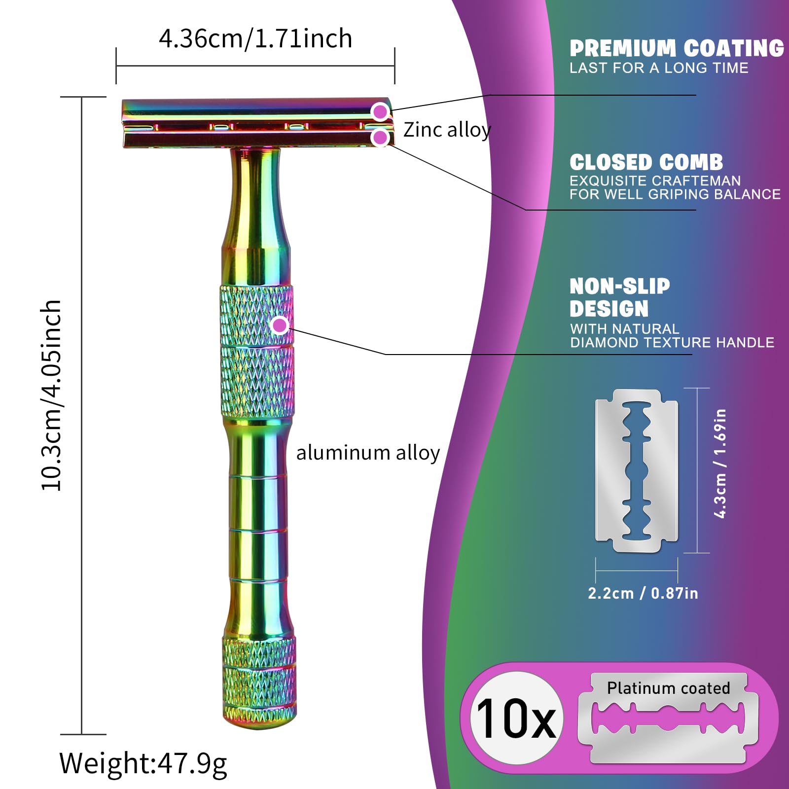 Safety Razor for Women and Men, Single Blade Razors for Men and Women, Reusable Metal Razors, with 10 Platinum Coated Safety Razor Blades, Face Razors for Men Shaving, Sustainable, Rainbow