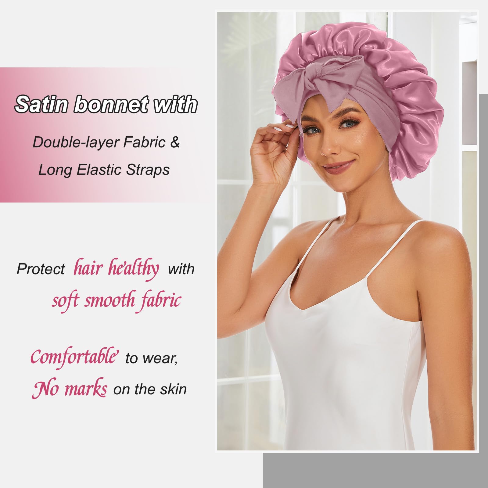 Satin Silk Bonnet Hair Bonnet for Sleeping Jumbo Sleep Cap, Bonnet for Women Curly Hair, Double Layer Bonnet with Tie Band, Shower Cap-Pink