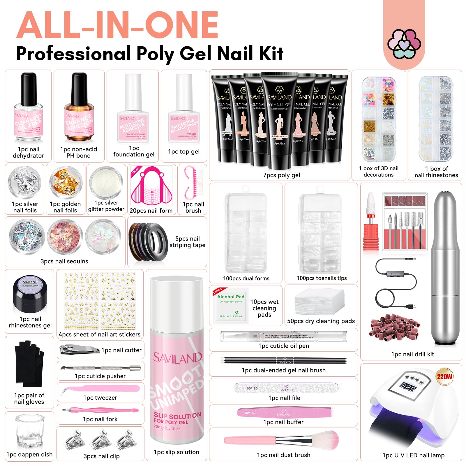 - ALL-IN-ONE GEL NAIL KIT - Saviland poly nail extension gel kit includes 5 colors poly gels, 1* 180W U V LED nail lamp with other nail art tools and nail accessoires to meet your various needs in doing poly nails, nail extension and so on. Perfect for starter DIY at home and manicurist use in a nail salon.