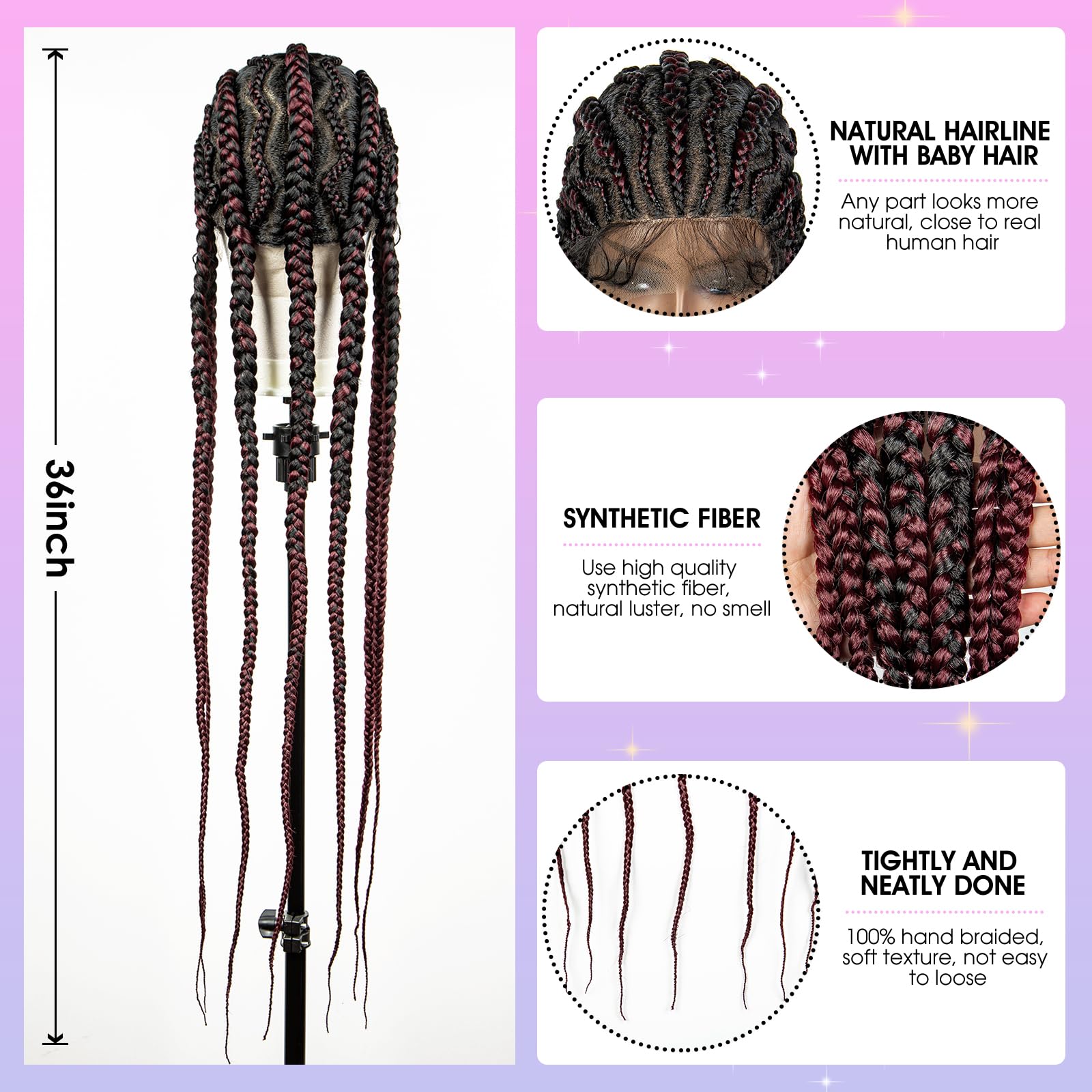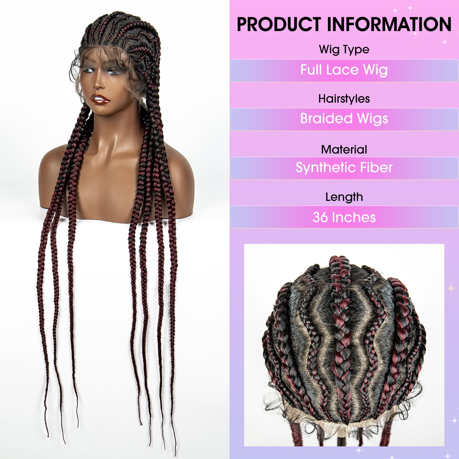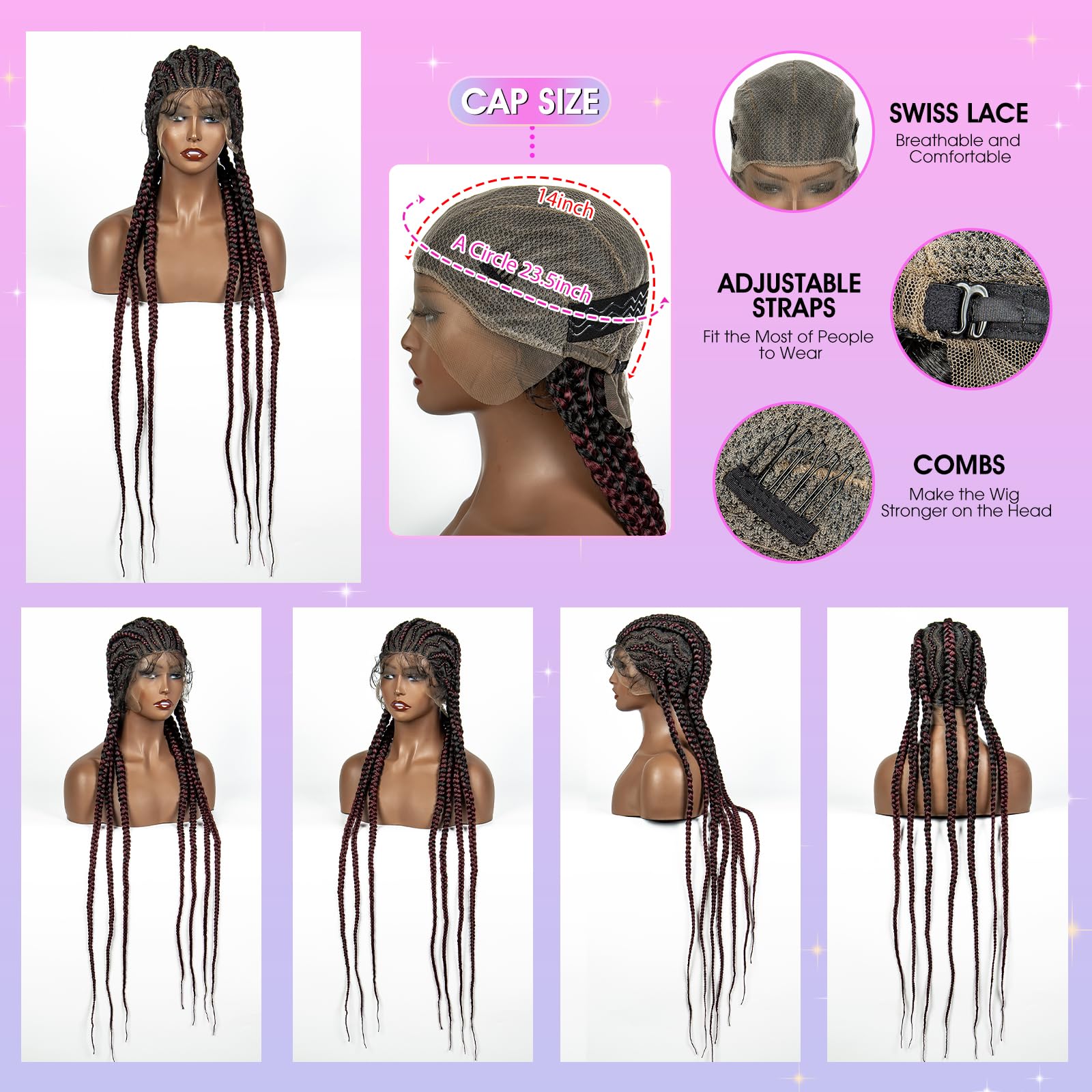 sedittyhair Braided Wigs Synthetic Full Head Lace Wig Braided Wigs for Black Women 36 Inches Braiding Hair Burgundy Color Lace Frontal Lightweight Artificial Braids Wigs with Baby Hair