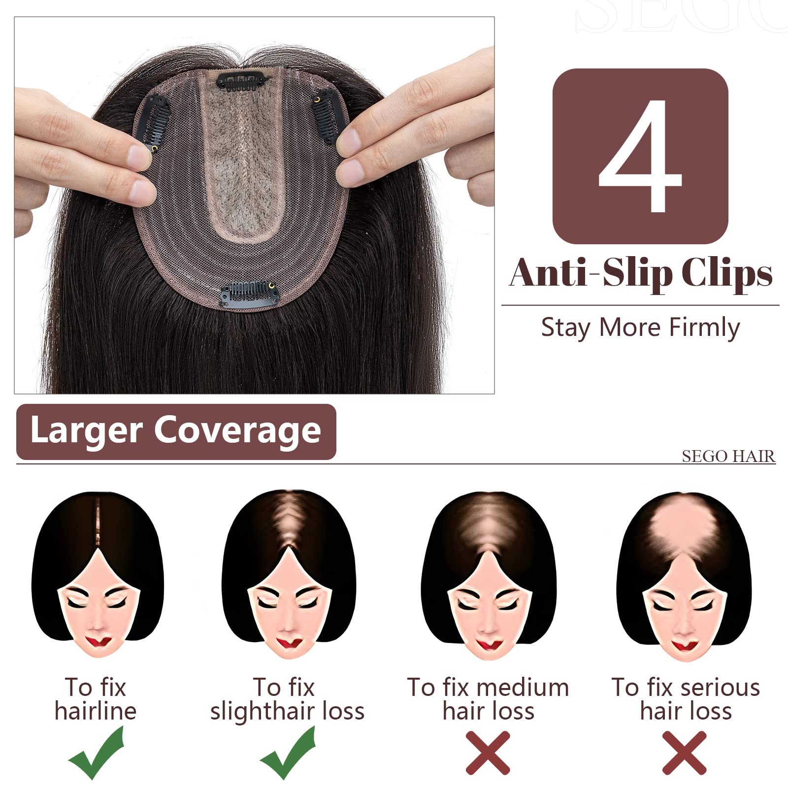- 【New Upgrade, Larger Coverage】This silk base hair topper is SEGO newly developed product, Designed for people in the beginning or middle stages of hair loss, thinning hair, gray hair. NOT SUITABLE for someone with nearly bald top cuz the clips may not stay in well.