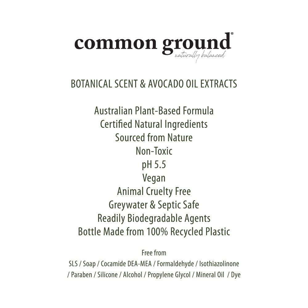 Details: Everything your family needs to get you through a month. A bottle of Common Ground Shampoo and Conditioner, with two bottles of Common Ground Body Wash. Then three bottles of Common Ground Hand Wash so you can have one at every sink. Naturally balance and regenerate your hair and skin with our plant-based formulas containing native avocado oil extracts, specifically developed for your everyday use. Common Ground Organic products are rich in cleansing performance yet gentle on your skin. The botanical scent and natural moisturizing effect combine to give a pleasant and long-lasting freshness. Avocado oil extracts contain vitamin E, antioxidants, and beneficial fatty acids that help protect your hair and skin from daily pollution. Restore and naturally balance your hair and skin condition for healthy and glowing looks. Avocado is soothing — Anti-germ and antioxidant = aids in synthesis of collagen and tissue regeneration. Avocado is Moisturizing — High in fatty acids and Vitamin E = soothes the skin to eliminate flaking. Avocado is Protective — Contains linolenic and luteic acids = creates a protective layer helping to combat UV. Our pH is optimized for your skin, hair, and scalp through our plant-based personal care products. All natural ingredients are carefully selected for the most delicate skin. Setting our pH to 5.5 allows the formulas to support the natural hydro-lipid film on your skin's surface. This aids the hair and skin's defense from external influences, including pollution.