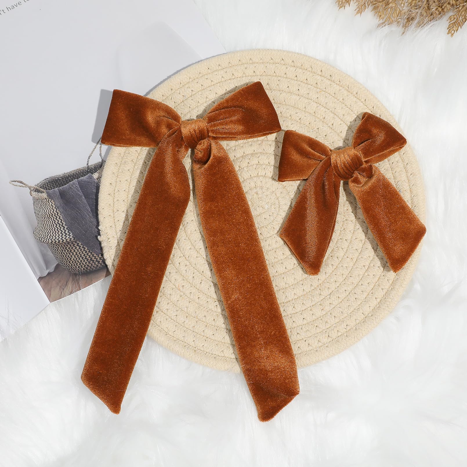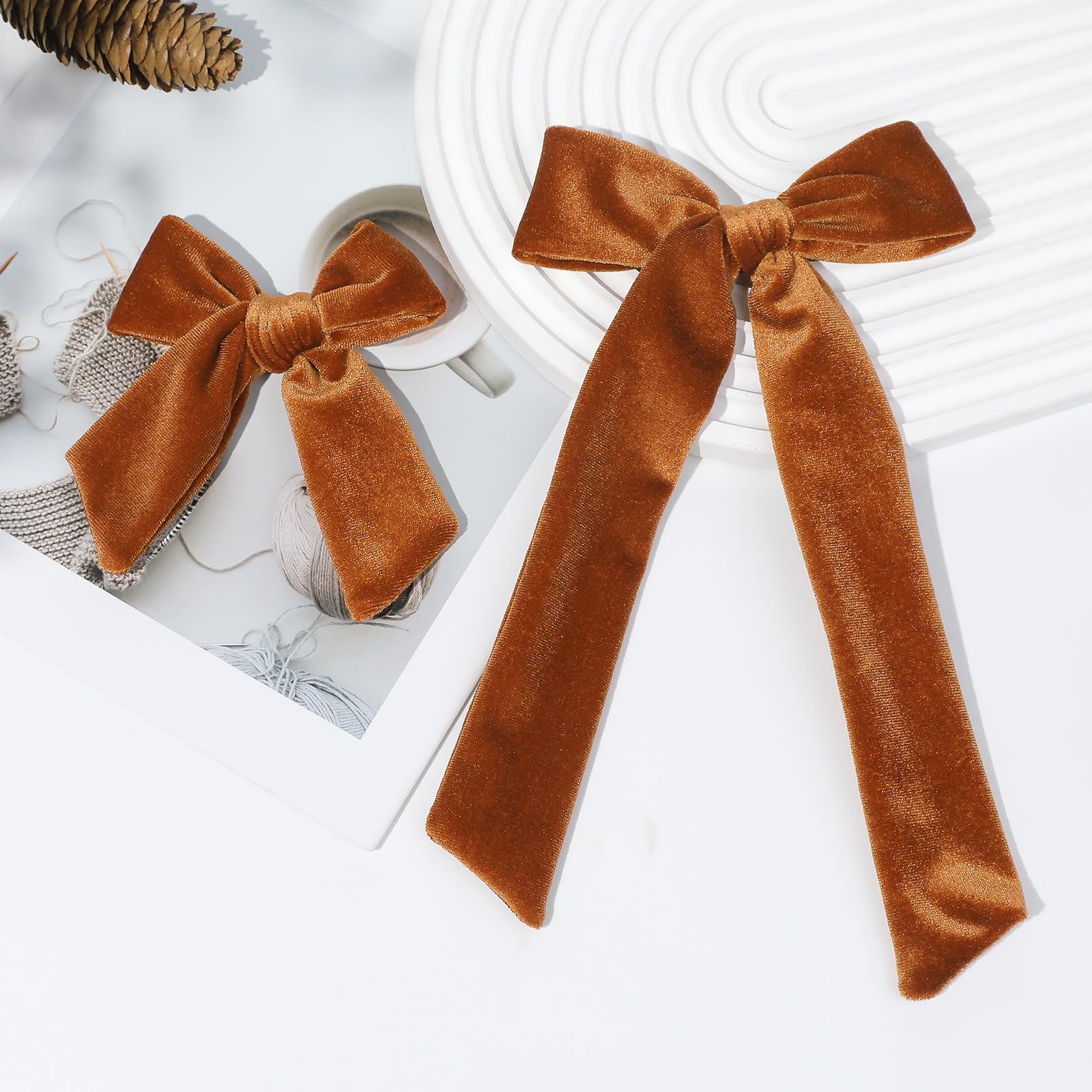 Soft Velvet Hair Bows for Toddler Girls - 2 Sizes (5" & 3.5") Long Ponytail Knot Bows with Alligator Clips - Hair Accessories for Little Kids, Orange & Brown
