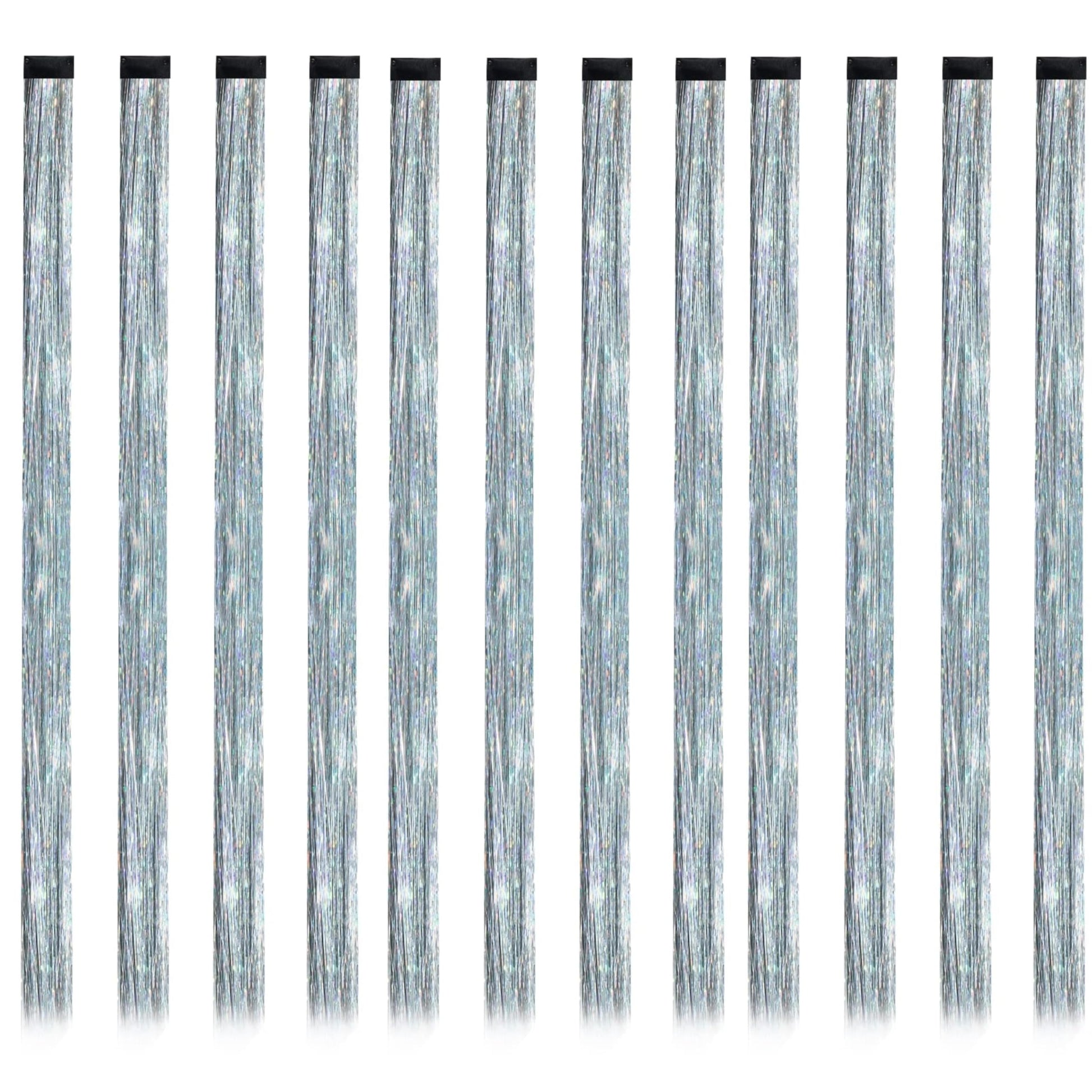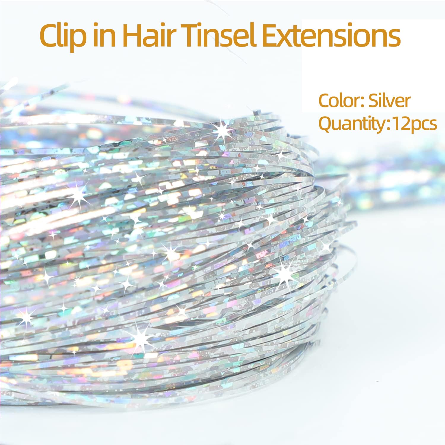SOYZMYX 12PCS Tinsel Hair Extensions Glitter Hair Extension Clip in Gold Sparkling Fairy Hair Tinsel Kit Shiny Highlights Colorful Heat Resistant Hair Accessories for Girls New Year Party(Silver)