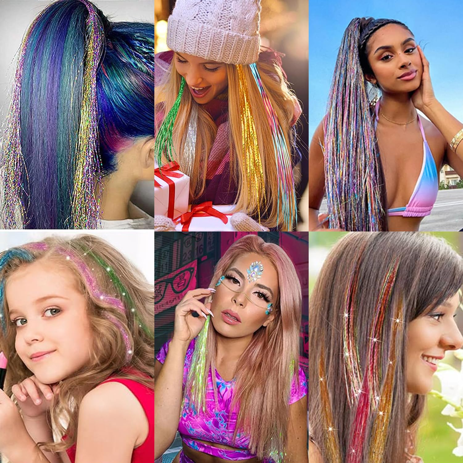 - [DIY Hair Style]: Each piece is 20 inches, and can be trimmed to the length of your hair and the location you wear. When worn, the tinsel hair blends into the hair naturally, adding a touch of brilliance.