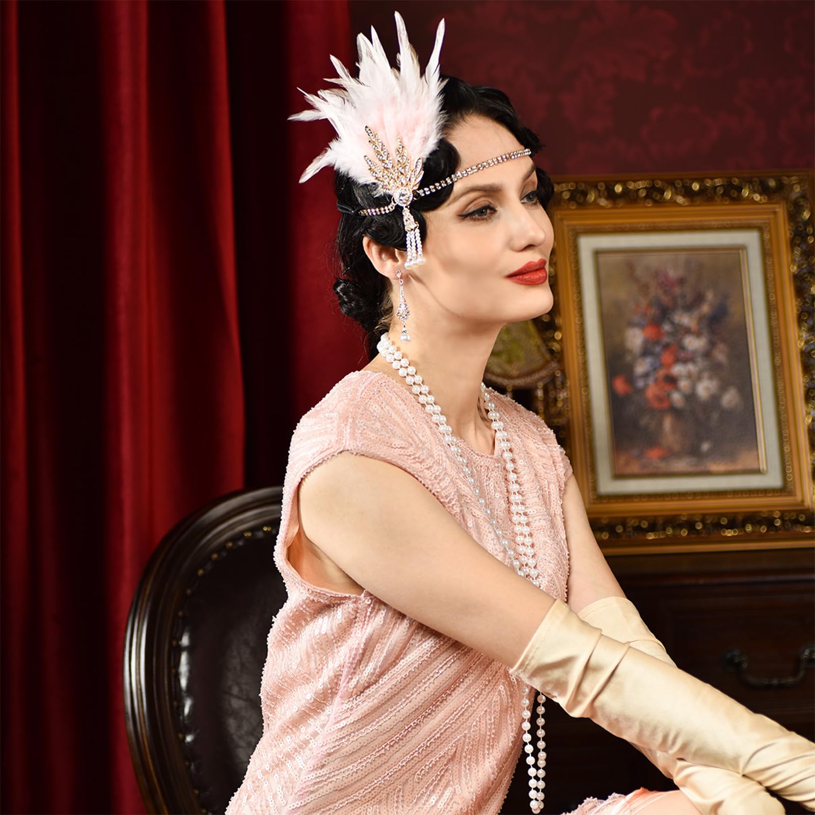 VENOFEN 1920s Flapper Headpiece Pink Feather Gatsby Headband Great Gatsby Headpiece Roaring 20s Feather Headpiece Pearl Tassel 20s Accessories for Women and Girls