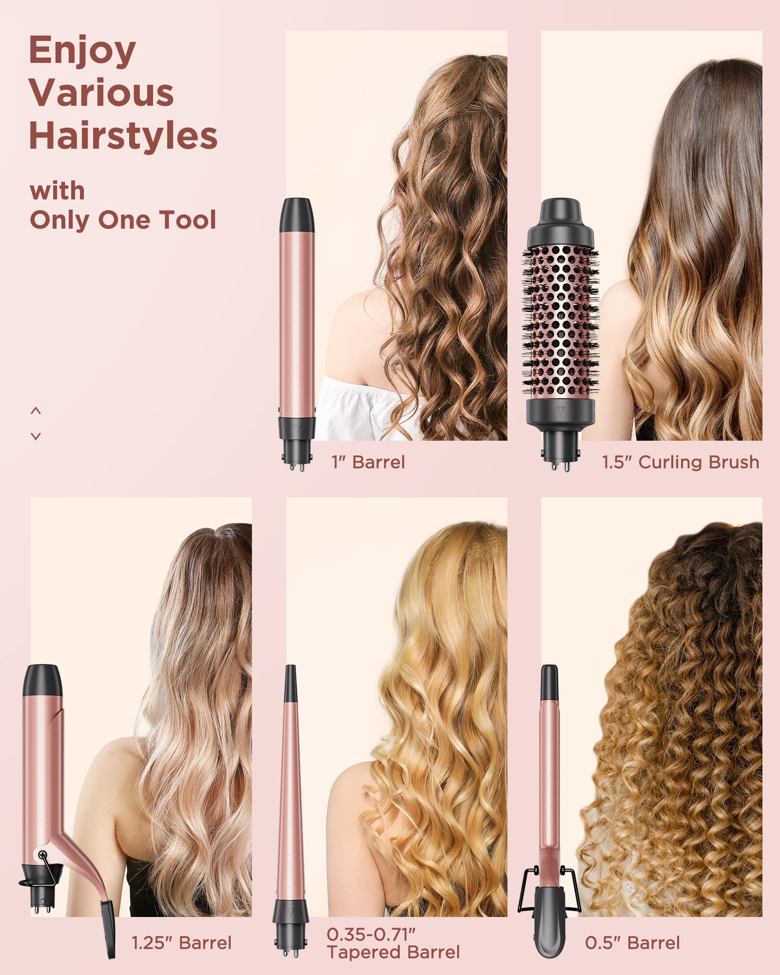 - Wavytalk 5 in 1 curling wands set makes different hairstyles: The upgraded version of the curling wand set contains 4 different sizes of interchangeable ceramic barrels with a curling brush. They are a 0.5 '' small curling iron; a 0.35-0.7” tapered curling wand; an 1' curling wand; an 1.25' curling iron; an 1.5 ' curling brush.