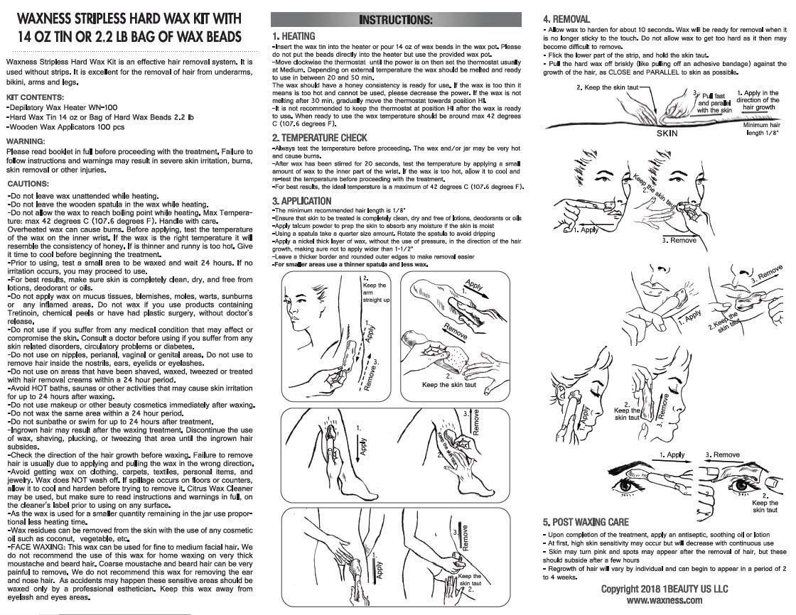 - This Stripless Waxing Kit contains: - 1 X Depilatory Wax Metallic Heater WN-5001