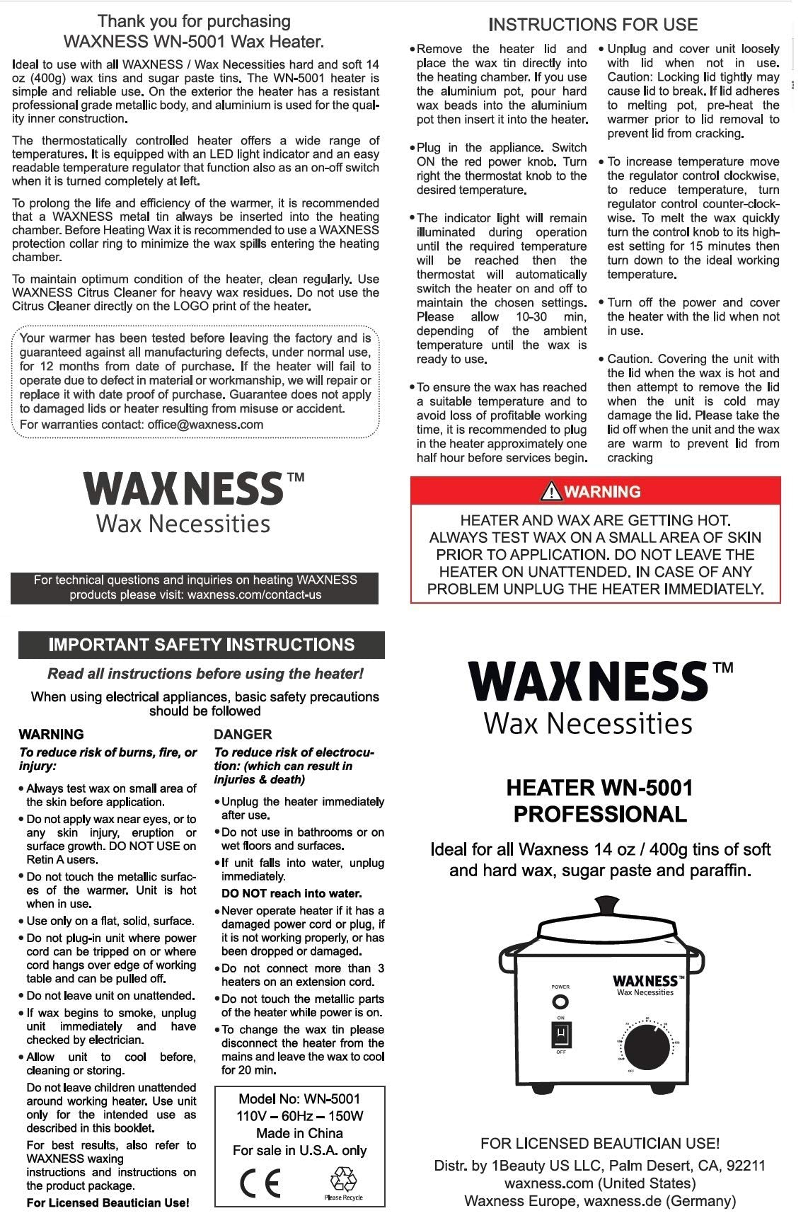 Details: DESCRIPTION 1. WAX WARMER Suitable for all types of hair removal, therapeutic waxes, and paraffin. Metallic durable exterior and aluminum interior. Holds 16 Oz wax. Aluminum wax pot (16 oz) with metallic lid included. 150W heating power. 1 year limited warranty. The Single Wax Heater is suitable for all types of hair removal, therapeutic waxes, and paraffin. Offers professional wax treatments. It melts all types of depilatory waxes: canned, broken, and in block form. Its internal heating element is built to last. With 4-1/8``diameter, 2-1/4`` deep interior heating chamber is designed to support most wax containers, such as 14-ounce size and other cans of the same diameter. The warmer includes two removable metal wax pot liners for use with loose wax, direct pouring, and easy cleaning. It measures 4`` in diameter and 2-5/8`` deep, will hold up to 18 fluid ounces of wax, and has a metal handle for convenience and safety. Use caution when handling hot items). The temperature can be adjusted up to 100 degrees Celsius for a quick and even wax meltdown. The thermostat control knob and circular heating element can be dialed back to medium to maintain ideal consistency. RoHS certified. Dimensions: units measure 7-1/4`` diameter, 5-3/8` tall. Metallic case Power: 150W Includes: - wax heating machine (wax not included) - one removable wax pot liner - USA standard grounded power-cord (120 volts) - instructions/owner`s manual. 2. GREEN TEA FILM HARD WAX BEADS 2.2 LB / 35.27 OZ - Ideal for underarm and bikini - Color well visible on the skin - With antioxidant green tea extract - Medium Hardening Time - Use without strips & low temperature Transparent film wax. Applied in a thin layer, removed as a film. Characterized by a short period of hardening which allows experienced cosmetologists to perform depilation procedures in conditions of tight work schedule. Effective for removal of coarse and short hairs. Ideal for armpits and deep bikini areas.