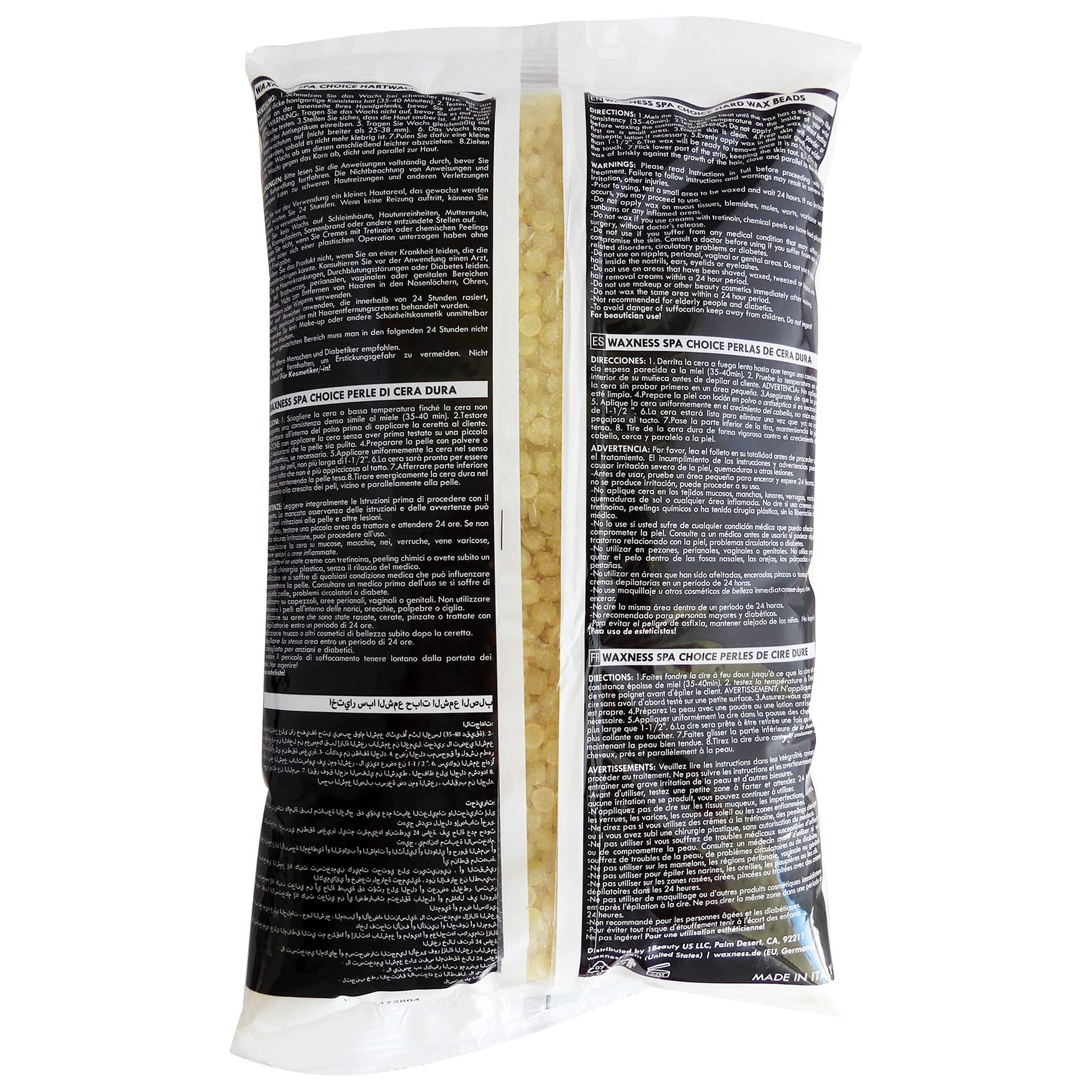Details: This Spa Choice Waxing Kit contains: -1X Waxness Single Wax Heater WN-5001 Holds 16 Oz -1 X Spa Choice Natural Honey Gel Hard Wax Beads 2.2 lb / 1 kg -100 X Large Body Wax Spatulas (Tongue depressors type) -3 X assorted collars (used with empty refill tins not included in this kit) -2 X Azulene Post Waxing Wipes - Kit User Instructions in English and Spanish. NOTE: This is a pre-melted product. You will usually receive it in granule form but occasionally you may receive it in chunks, a mix of chunks and beads, bigger pieces or bricks. This will not affect the quality of the product that can be used normally.