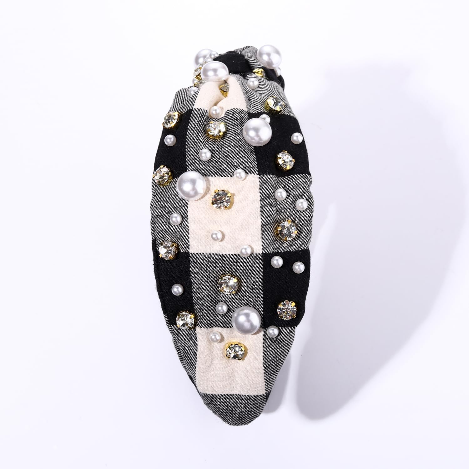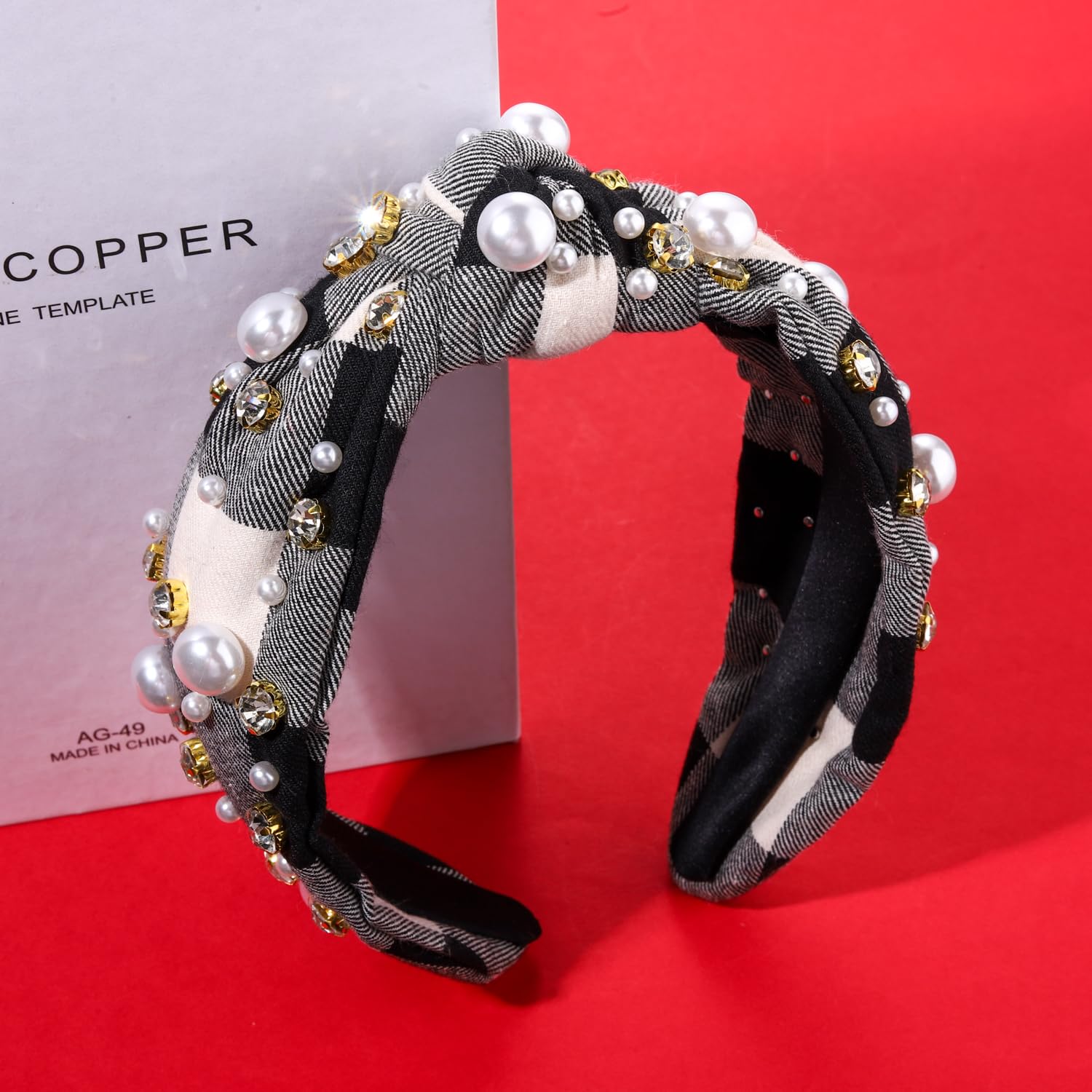 Women's Xmas Embellished Plaid Knotted Headband with Rhinestones, Crystals and Pearls - Holiday Outfit Accessory Gift (White Black)