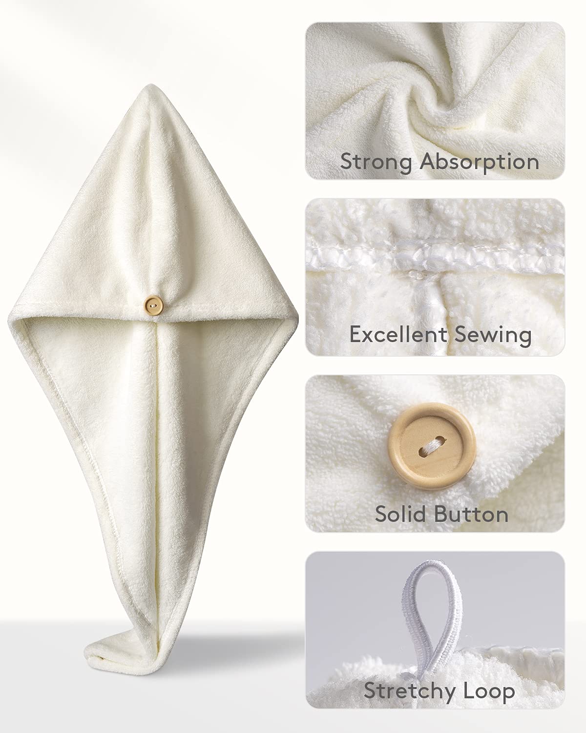 - SOLID BUTTON AND STRETCHED LOOP: The button and strap are firmly stitched on hair towel wrap, no worries about slipping or dripping, ideal hair wraps for women for makeup, bath, facial, and massage, and also perfect for a fun time at the swimming pool or a great day at the beach, wet hair is no longer an obstacle.